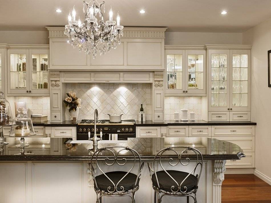 Классический стиль подразумевает под собой роскошь, и это не сложно воплотить, при наличии средств. Когда бюджет не ограничен определенной суммой, то эталонная кухня в стиле классика будет выглядеть, примерно, так – мебель из натурального дерева, люстры из хрусталя в стиле винтаж, техника, аккуратно встроенная, ламинат или паркет, фарфоровая посуда.