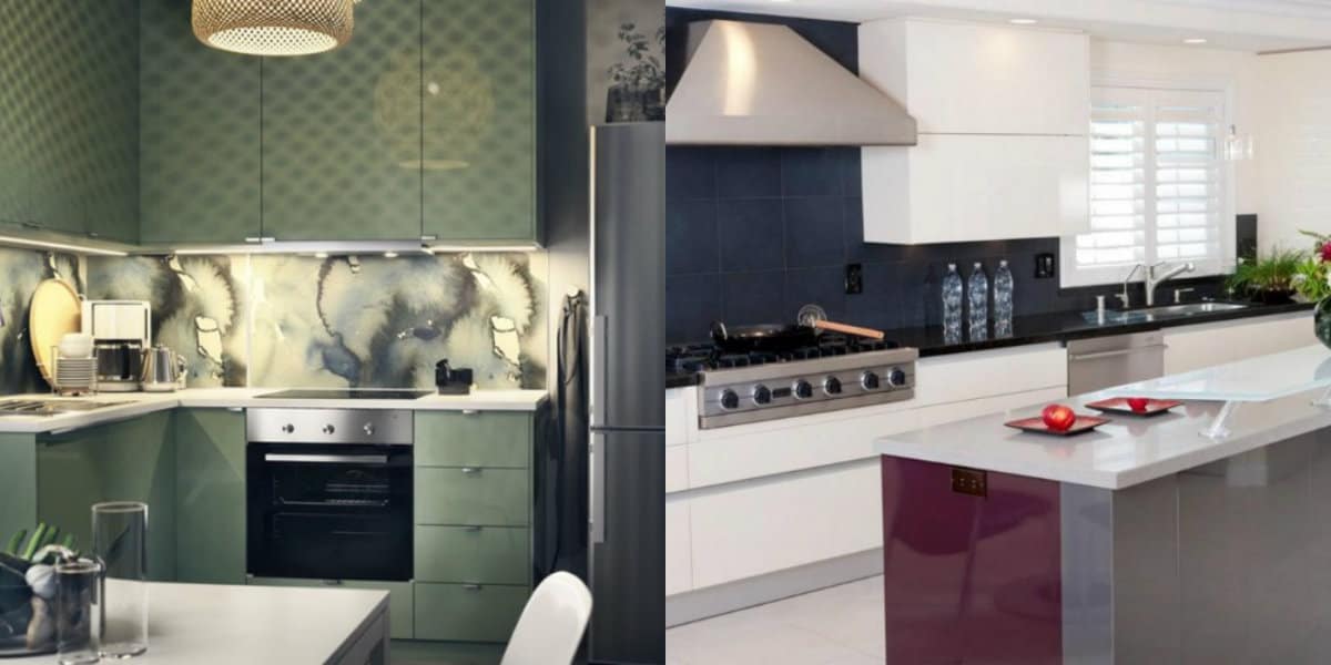 Кухни новинки 2022 оригинально выглядят и благодаря витражам. Ими украшаются фасады система хранения и маскируют встроенную бытовую технику. Витражи будут смотреться еще более необычно, если использовать декоративную подсветку.