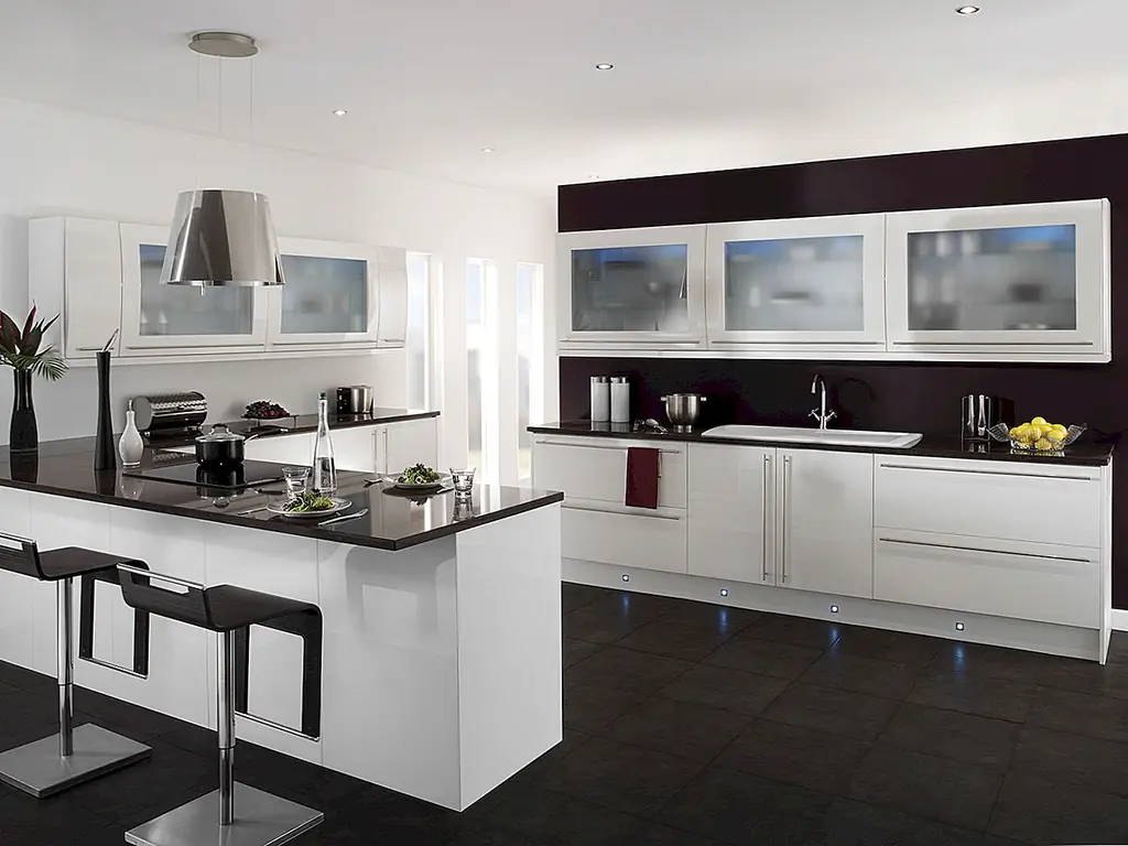 Если площадь небольшая, подойдет линейный или угловой мебельный гарнитур, с барной стойкой или откидным столиком. Если же места предостаточно, красиво будет смотреться в центре кухни островная конструкция.
