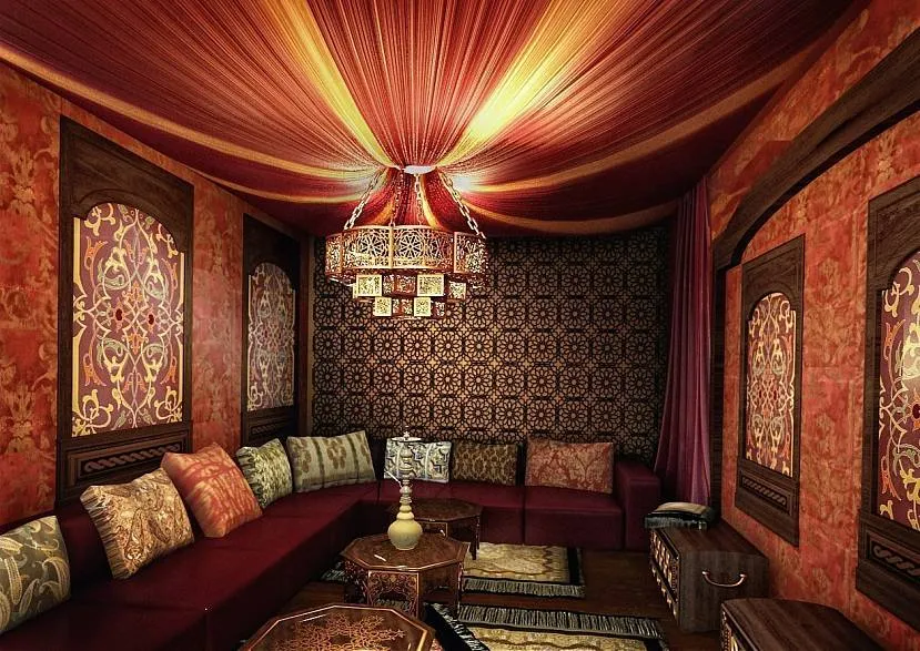 Буквально повсюду размещена вязь восточного узора. Этот элемент присутствует на тканях, на напольных покрытиях, на стенах, мебели и даже на потолках. Чаще всего используются геометрические мотивы.