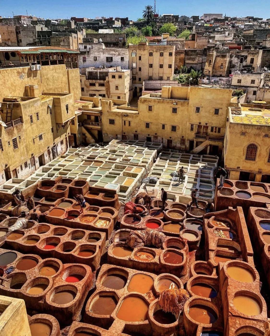 Фес — потеряйтесь в лабиринте улочек старого города. Это настоящая сказка про Алладина! Посетите древние красильни, где уже не одну сотню лет по старинной технологии красят кожу. Чтобы найти хорошую точку обзора, надо постараться. Местные детишки с удовольствием проводят вас на крышу своего дома, откуда открывается хороший вид на красильни. Возьмите конфет и мелочи, они будут довольны пообщаться с иностранцами.