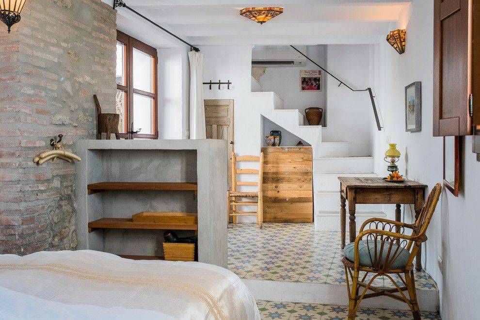 Марокканская спальня, как и другие комнаты, имеет минимальный набор мебели: широкую кровать, пару тумбочек и столик. Если помещение просторное, то рядом размещают традиционный диванчик (кушетку, топчан) с кофейным столиком. Акцентную стену у изголовья кровати декорируют нишей, которая имеет традиционный восточный купол с вытянутым кончиком. Его украшают композицией из керамических, стеклянных, глиняных или деревянных элементов. Потолок венчает небольшая люстра, а по обе стороны кровати симметрично устанавливают бра. Окна декорируют коваными решетками. Закрывают их воздушным тюлем. Пол обязательно застилают ковриками. Шлифуют композицию с помощью кальяна, комнатных растений в горшках, тарелок с фруктами и восточными сладостями на столиках.