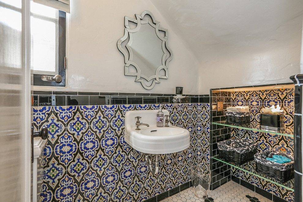 К примеру, скомпоновать отделку стен плиткой в виде пчелиных сот, декорированных восточными орнаментами с кричащими тонами, с оформлением потолка и пола крупными плитами керамогранита белоснежного или песочного тона с едва заметными этническими узорами. В качестве связующего звена может выступить огранка частей помещения фризом, украшенным тонами, встречающимися на пестрой облицовке стен и нейтральной отделке верхней и нижней части помещения.