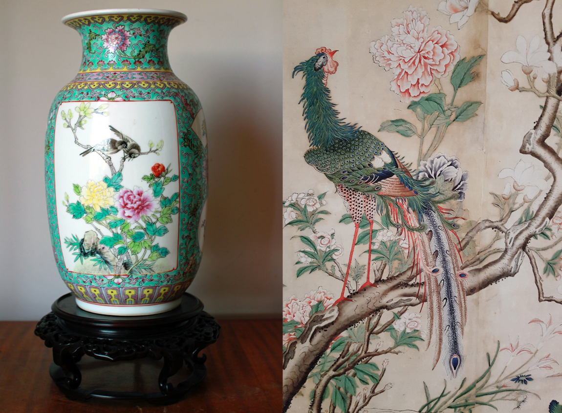 Тонкие изгибы цветущей дикой сливы, пышные пионы и хризантемы, райские птицы, китайские пагоды, горные вершины, синие львы, похожие на собак — всё это сказочный мир шинуазри.