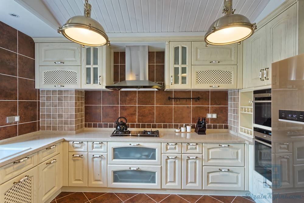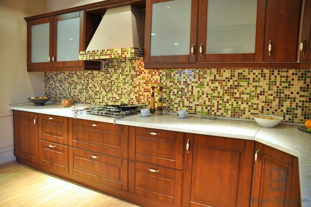 Наиболее обычный вариант фартука — плитка из керамики или мелкая плитка. Не нужно боятся применять фрески, изразцы, многообразные орнаменты. Оригинальные сочетания цветов, многообразные узоры — и такой фартук будет реальным украшением Вашей кухонной комнаты.