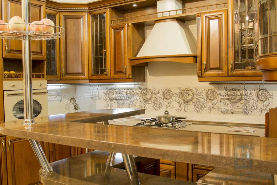Завершальный вариант выглядит очень красиво, однако важно понимать, что рисунок столешницы должен комбинироваться с фартуком. В другом случае вы получите вздорный китч
