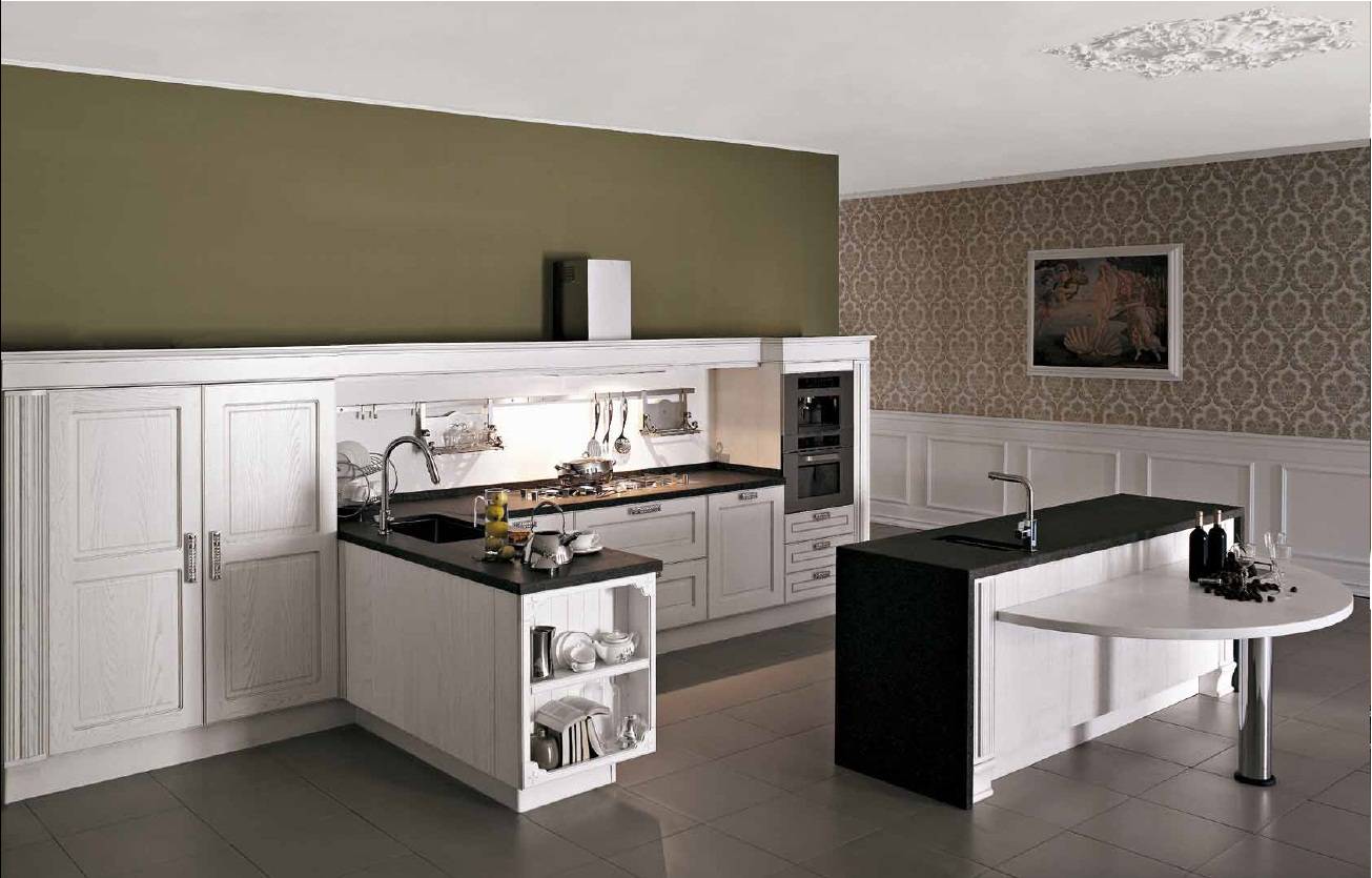 Интерьер квартиры выполнен в светлых, преимущественно сливочных тонах, контрастом и своеобразной основой ему служит пол из массива американского ореха насыщенного тёмного цвета. Единственным исключением в светлой меблировке комнат стала обеденная группа орехового цвета. Кухня, L’Ottocento