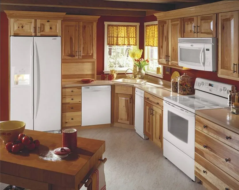 Используйте простую, но элегантную мебель из дерева в которую можно будет встроить технику комплементарных тонов. Для освещения подойдут простые светильники классического вида.