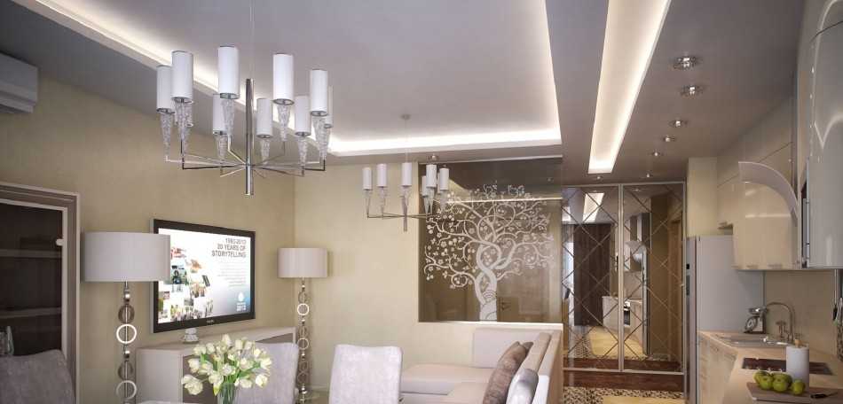 Как прямая, так и многоуровневая отделка будет смотреться гармонично. Используйте встроенные точечные светильники либо тонкие бордюрчики из лепнины по периметру всей комнаты. Очень красиво смотрятся и зеркальные поверхности.