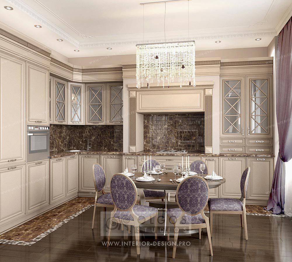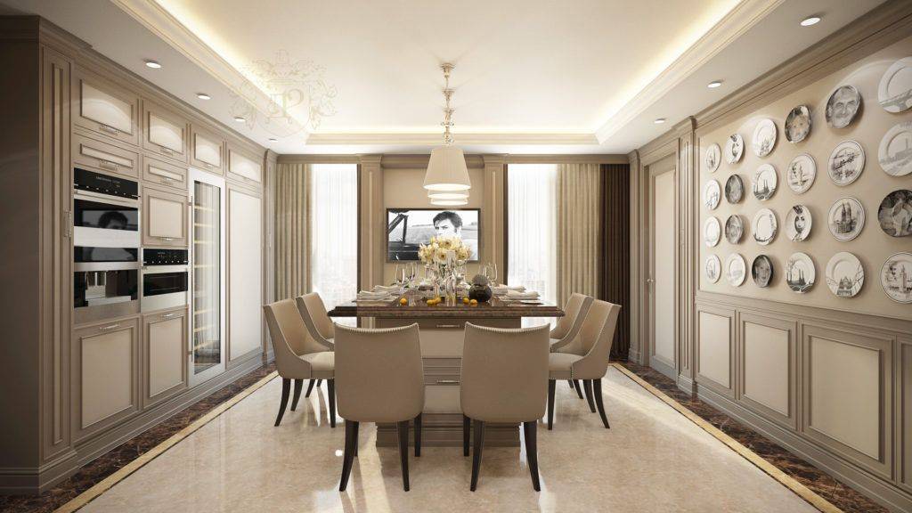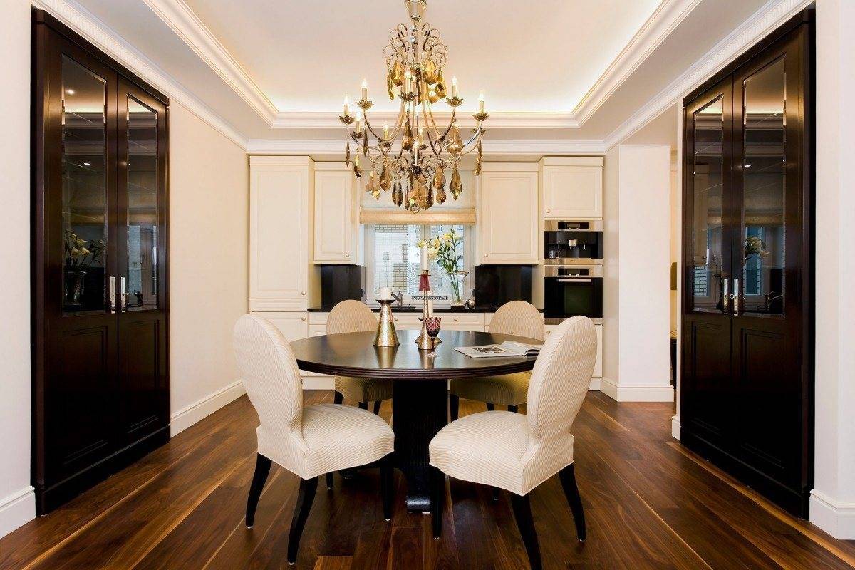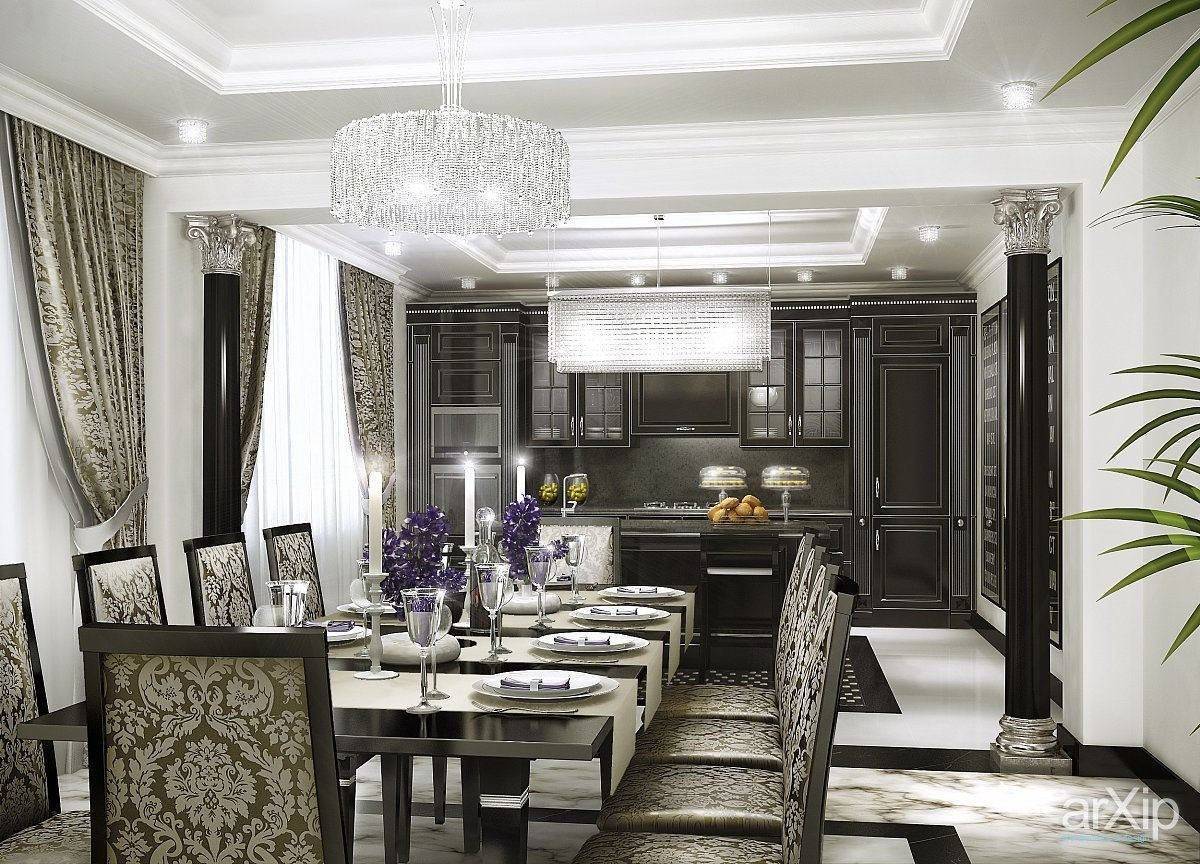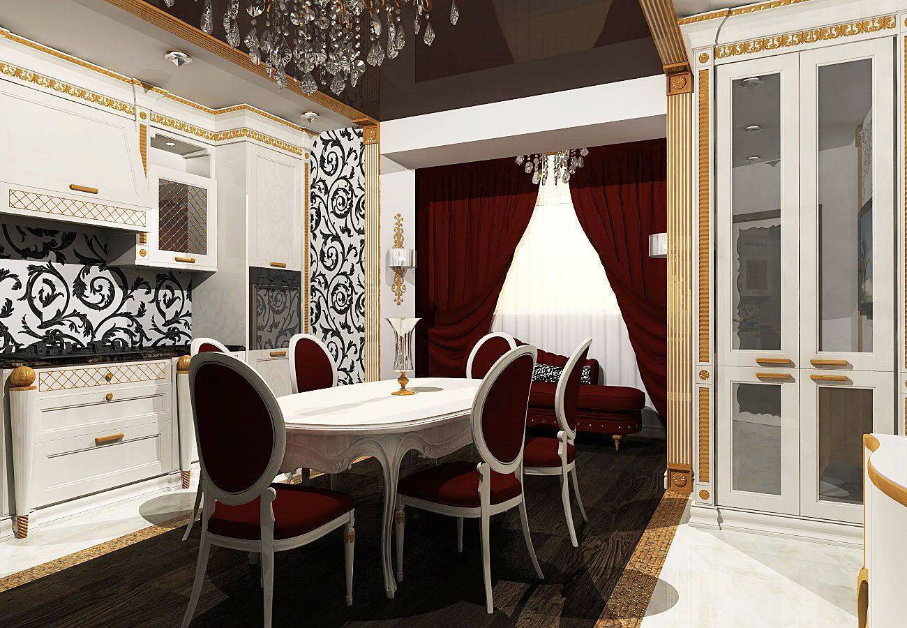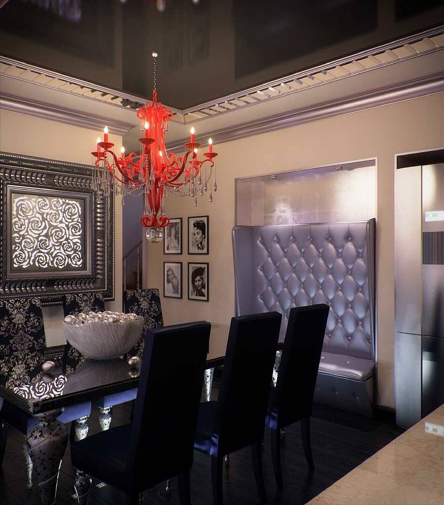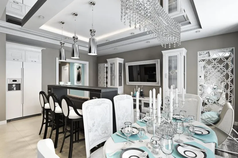 Оформленные таким образом столовые достойны внимания знатных особ. Ключевым элементом становится массивный стол овальной или прямоугольной формы, мягкие стулья или полукресла, обитые велюром и, возможно, украшенные каретным галстуком, а над столом красуется неизменная люстра. Особенностью этого стиля является небольшая, но элегантно оформленная барная стойка с подходящими стульями