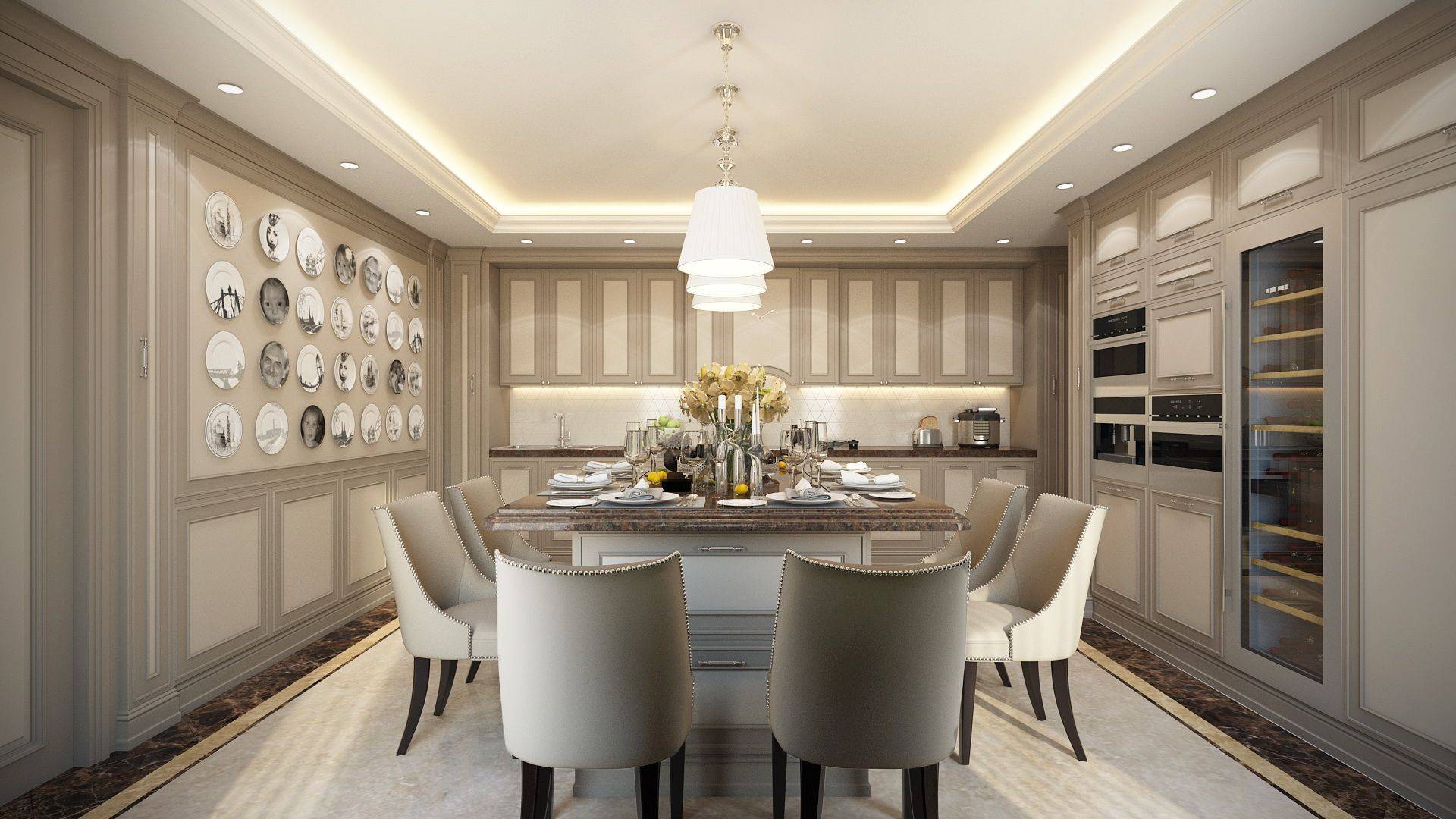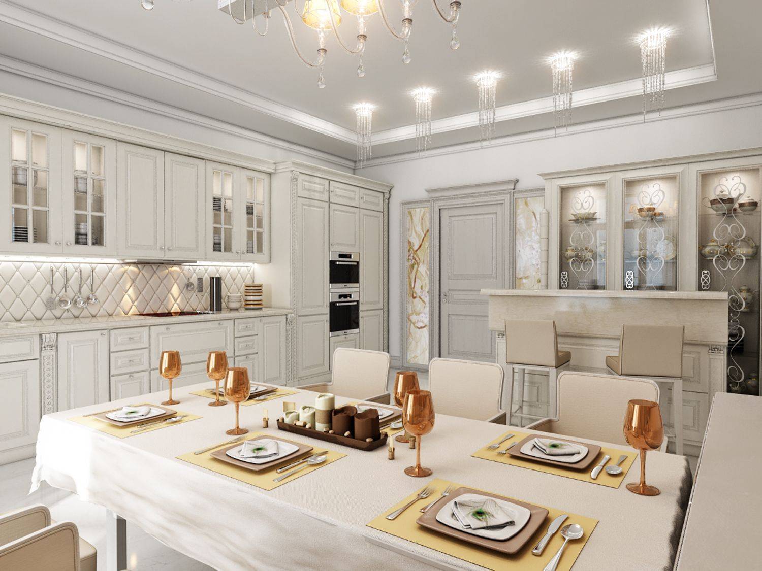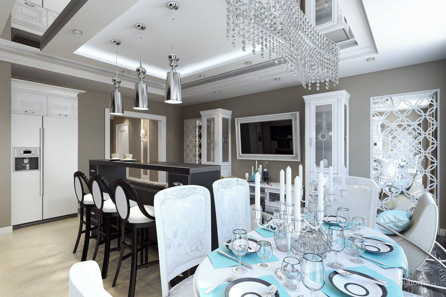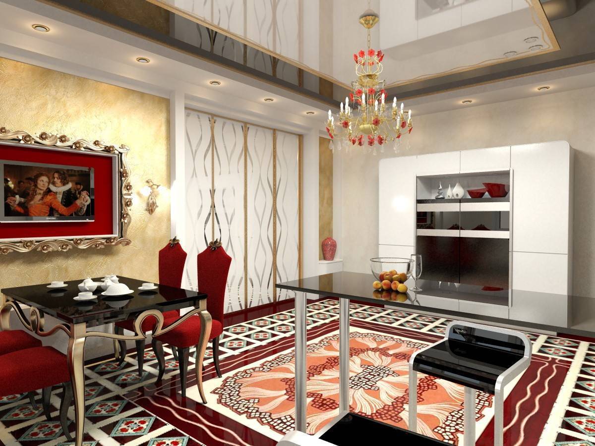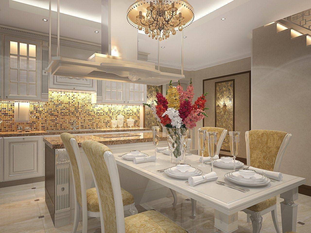 Оформленные таким образом столовые достойны внимания знатных особ. Ключевым элементом становится массивный стол овальной или прямоугольной формы, мягкие стулья или полукресла, обитые велюром и, возможно, украшенные каретным галстуком, а над столом красуется неизменная люстра. Особенностью этого стиля является небольшая, но элегантно оформленная барная стойка с подходящими стульями