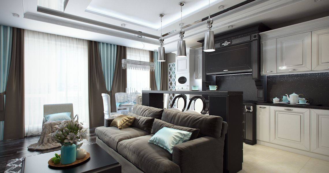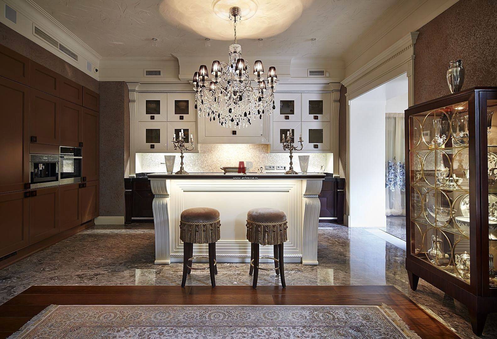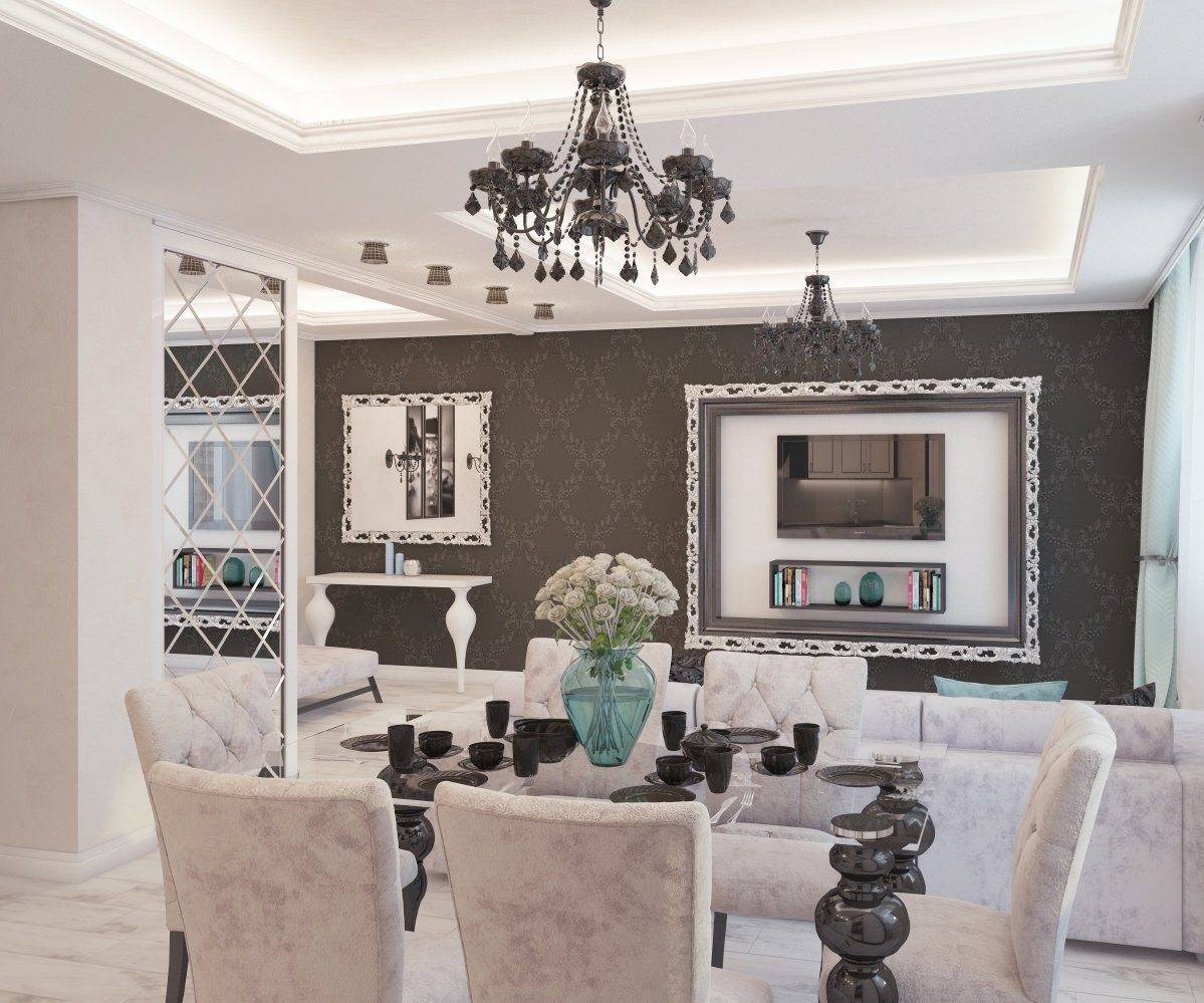 Цветовая гамма подчёркивает статусность дизайна, визитная карточка стиля – черно-белый контраст, называемый клавишами пианино. Дополнительными оттенками выбирают бежевый, слоновую кость, бордовый, шоколадный, терракотовый.