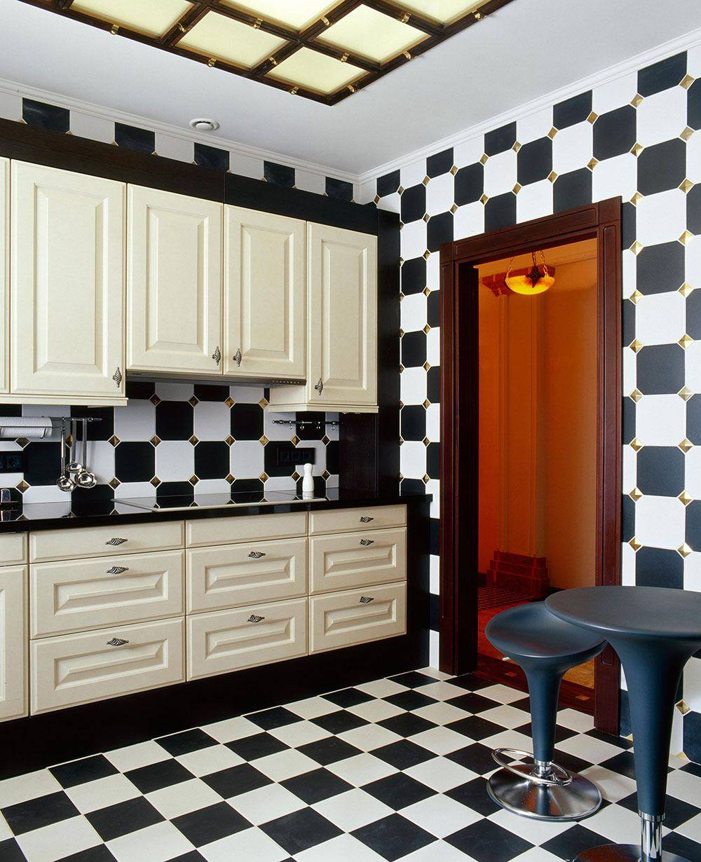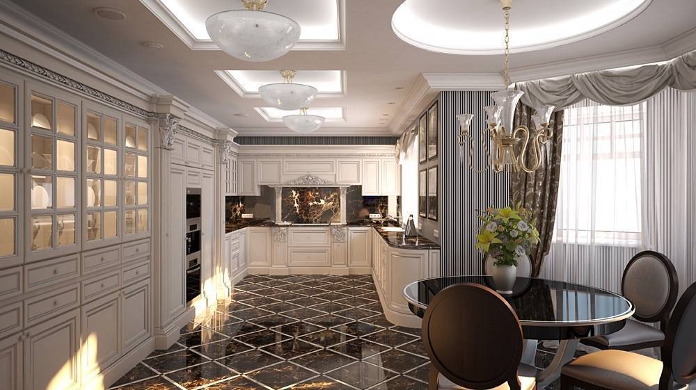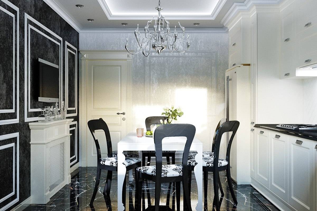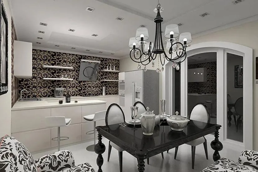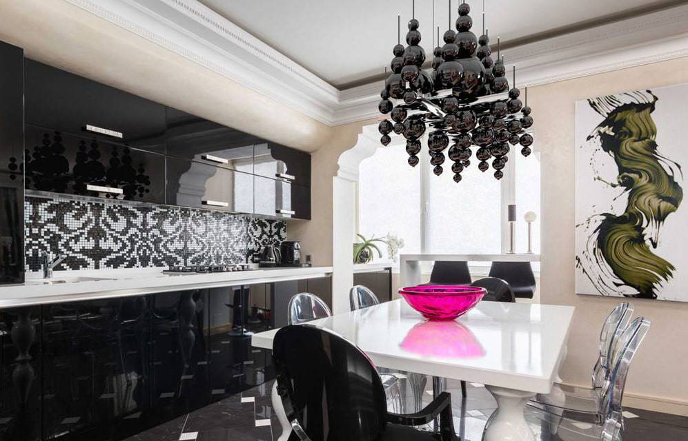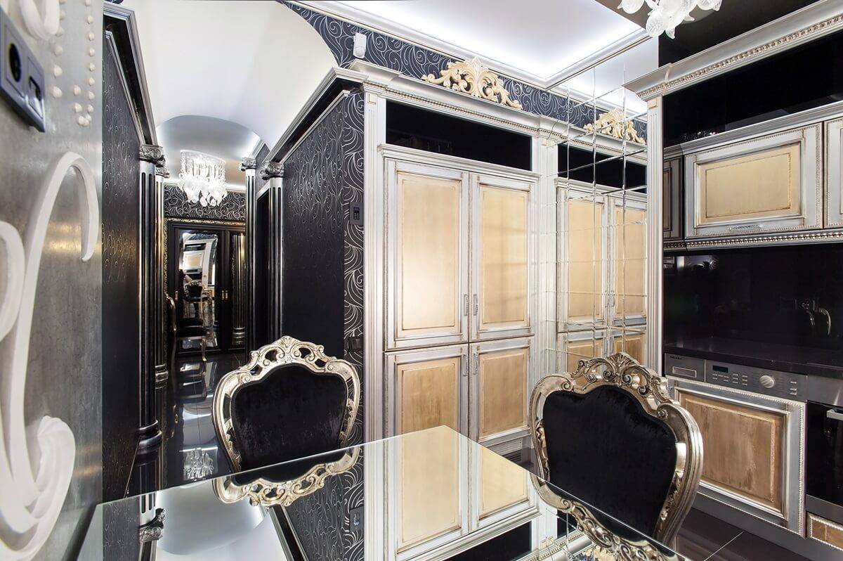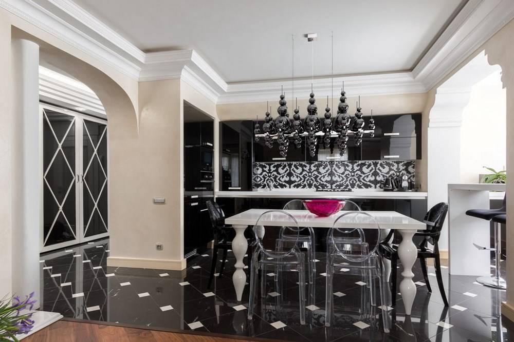 Планировка кухни отличается размахом и комфортом. Удачнее всего в интерьер вписывается гарнитур с островом. Классический дорогой паркет на полу заменяется черно-белой плиткой, выложенной в шахматном порядке, или контрастными ромбами. Обивка стульев выполняется из натуральной кожи. Для визуального увеличения пространства над барной стойкой размещается массивное зеркало в шикарной раме. С целью выделения обеденной и рабочей зон на потолке устраиваются перепады высоты, а на полу создается просторный подиум для стола и стульев. Основные черно-белые тона с небольшими вариациями позволяют гармонично вписать в интерьер кухонную технику со стальными или пластиковыми элементами.