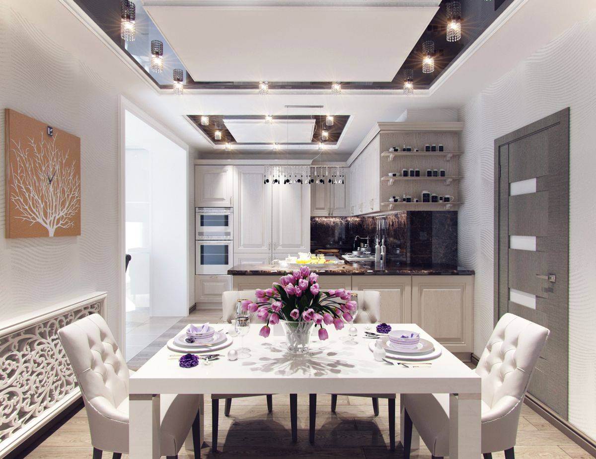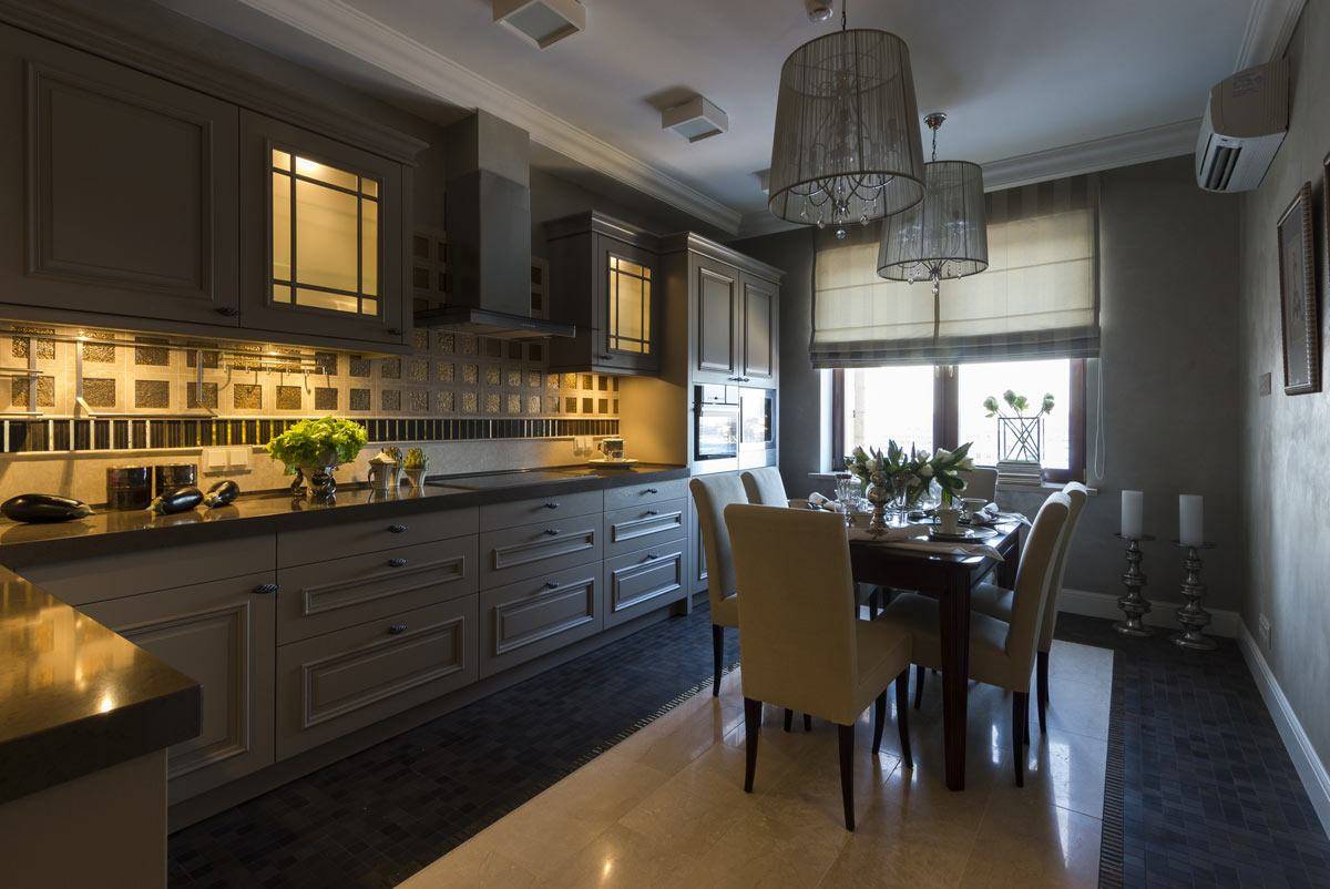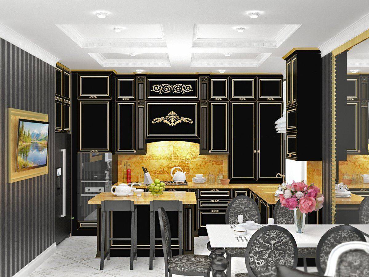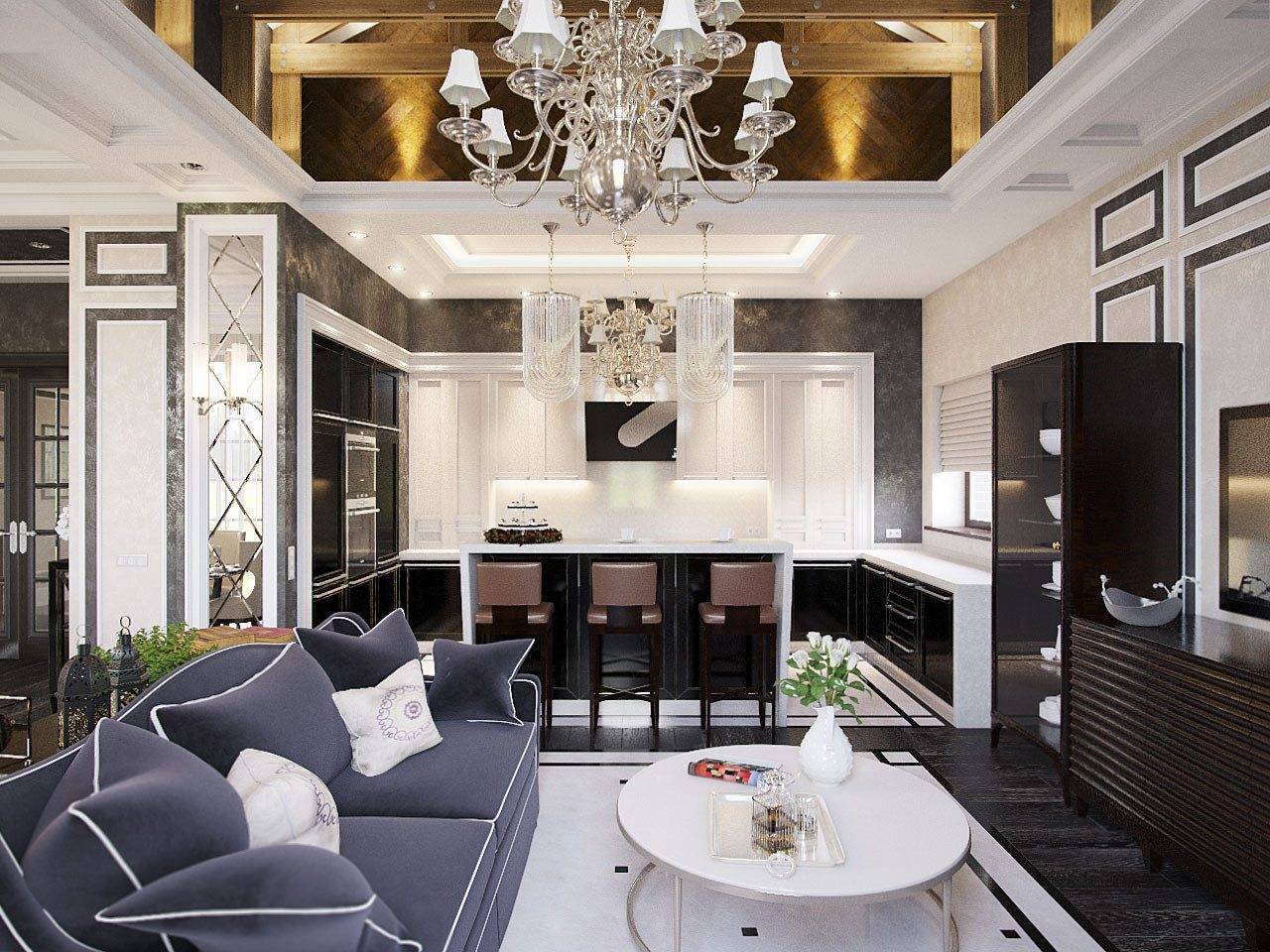 Планировка кухни отличается размахом и комфортом. Удачнее всего в интерьер вписывается гарнитур с островом. Классический дорогой паркет на полу заменяется черно-белой плиткой, выложенной в шахматном порядке, или контрастными ромбами. Обивка стульев выполняется из натуральной кожи. Для визуального увеличения пространства над барной стойкой размещается массивное зеркало в шикарной раме. С целью выделения обеденной и рабочей зон на потолке устраиваются перепады высоты, а на полу создается просторный подиум для стола и стульев. Основные черно-белые тона с небольшими вариациями позволяют гармонично вписать в интерьер кухонную технику со стальными или пластиковыми элементами.
