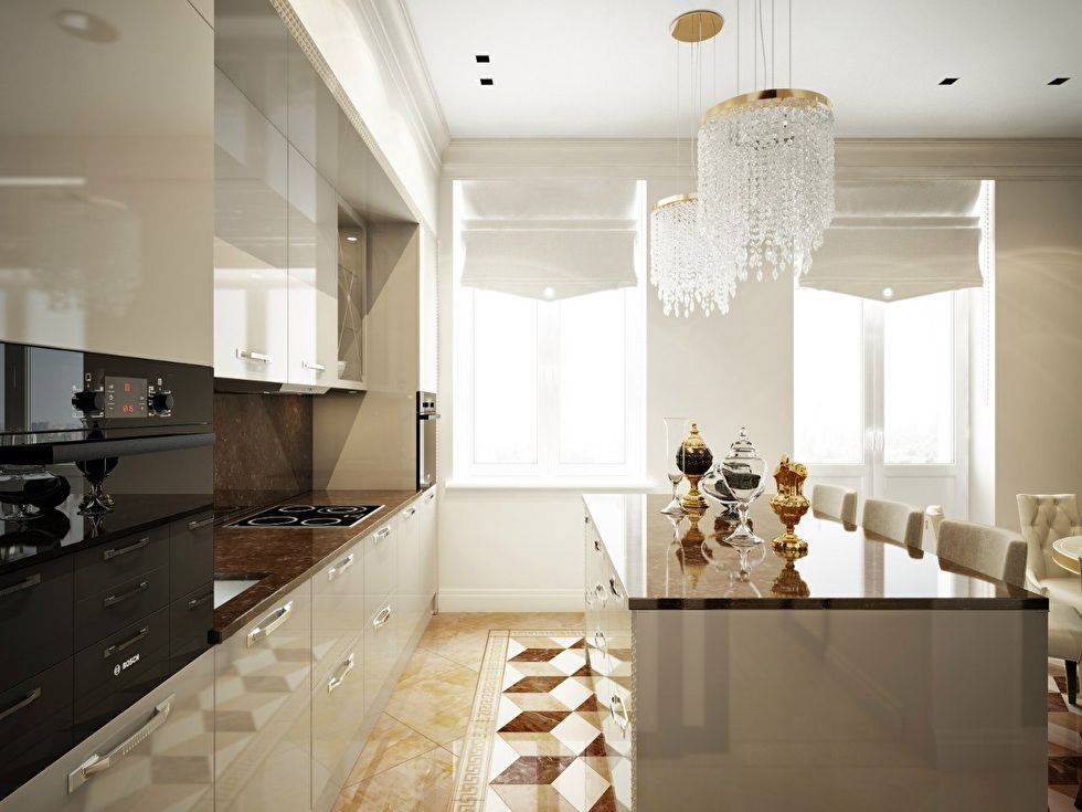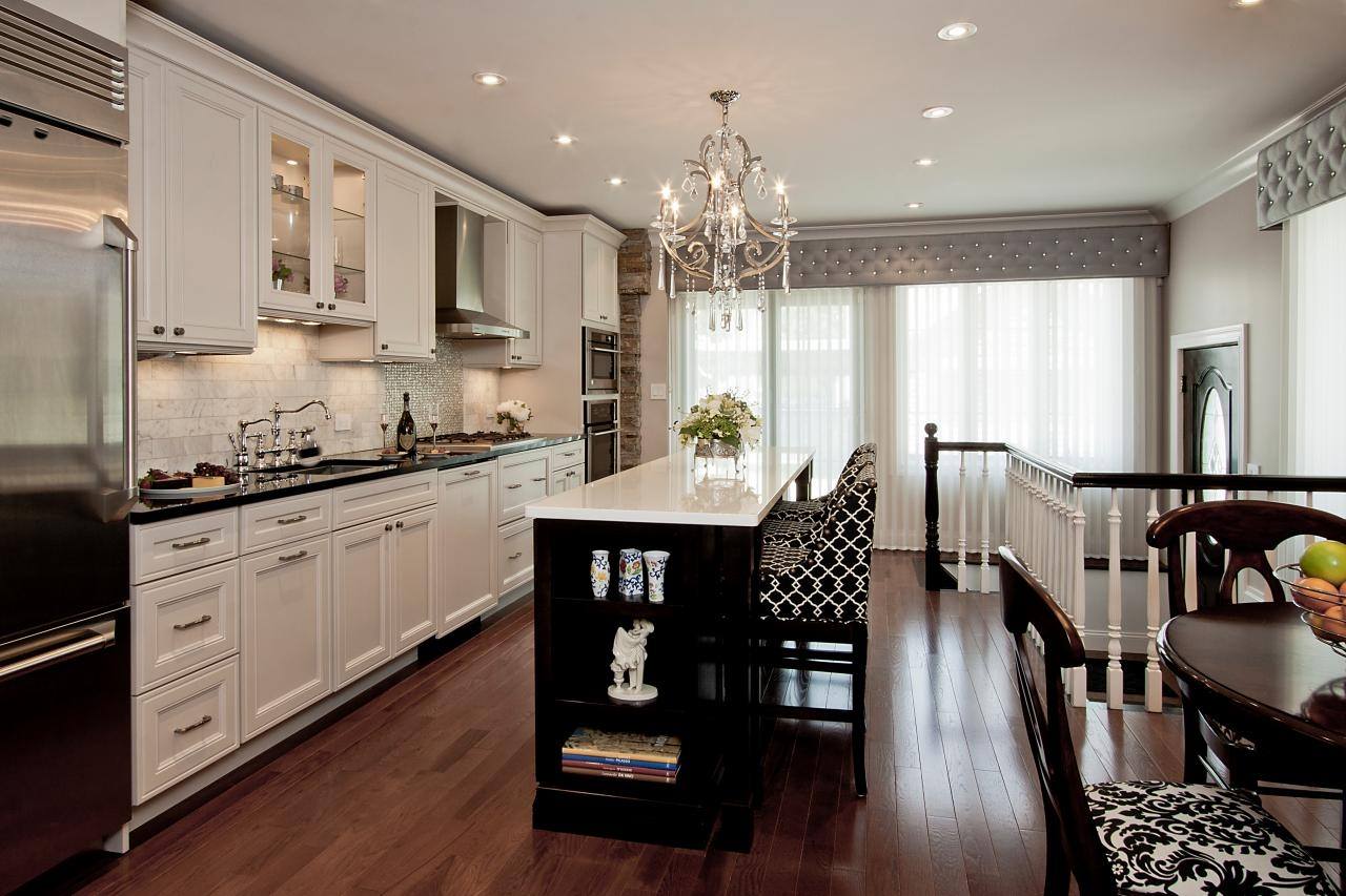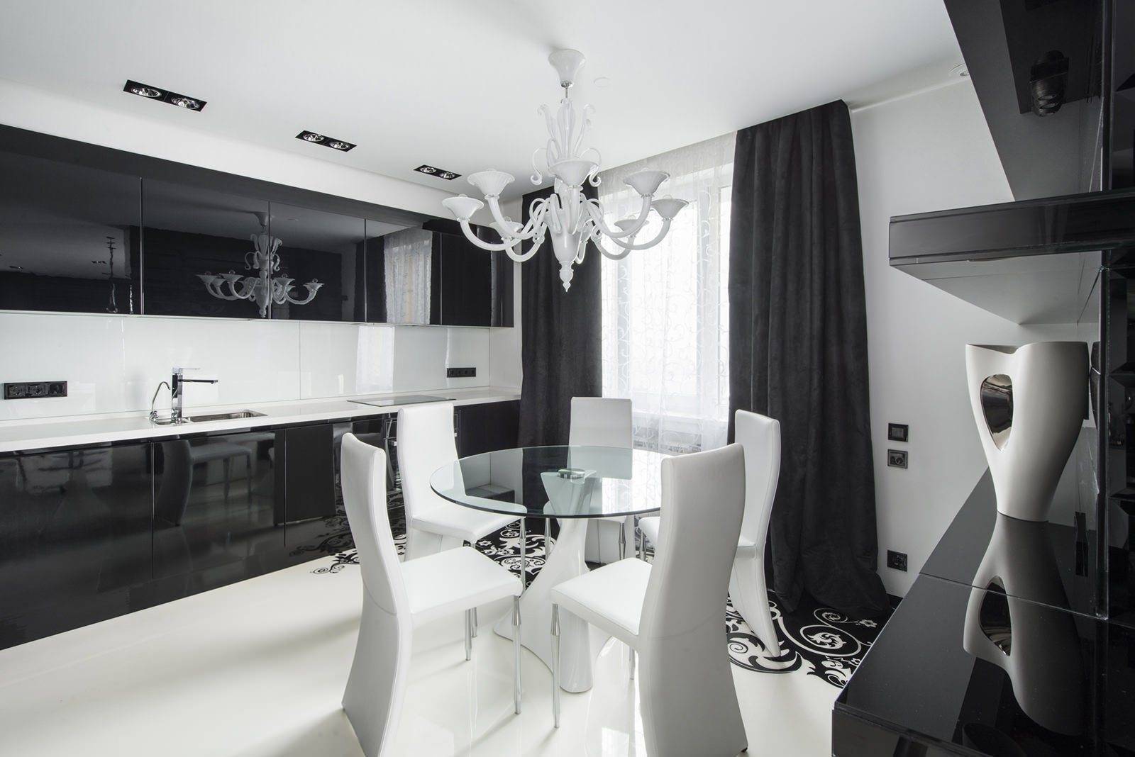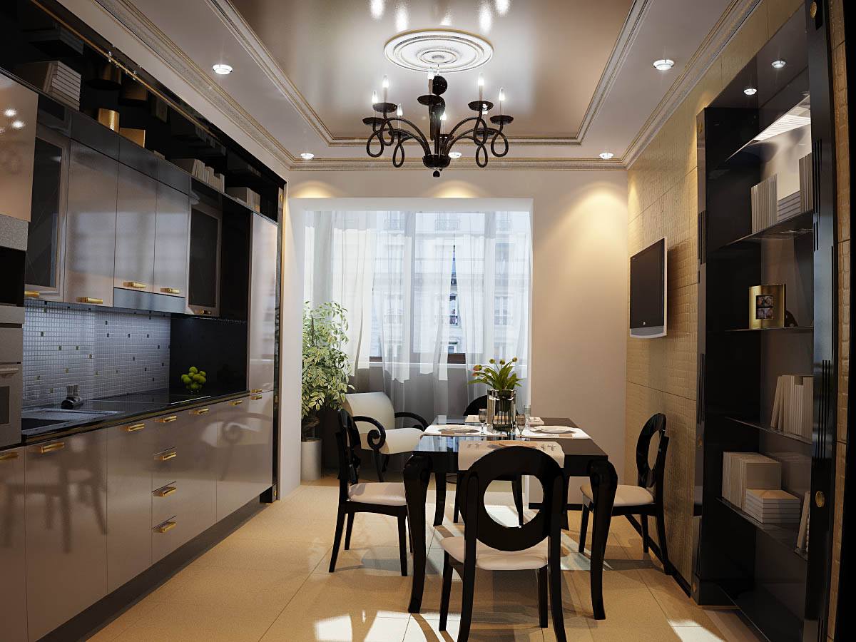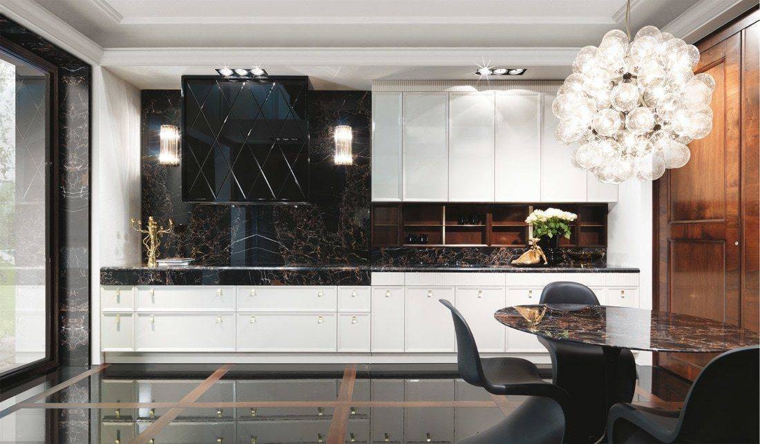 Планировка кухни отличается размахом и комфортом. Удачнее всего в интерьер вписывается гарнитур с островом. Классический дорогой паркет на полу заменяется черно-белой плиткой, выложенной в шахматном порядке, или контрастными ромбами. Обивка стульев выполняется из натуральной кожи. Для визуального увеличения пространства над барной стойкой размещается массивное зеркало в шикарной раме. С целью выделения обеденной и рабочей зон на потолке устраиваются перепады высоты, а на полу создается просторный подиум для стола и стульев. Основные черно-белые тона с небольшими вариациями позволяют гармонично вписать в интерьер кухонную технику со стальными или пластиковыми элементами.