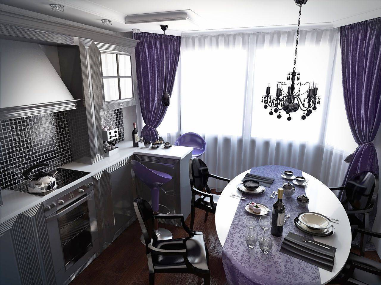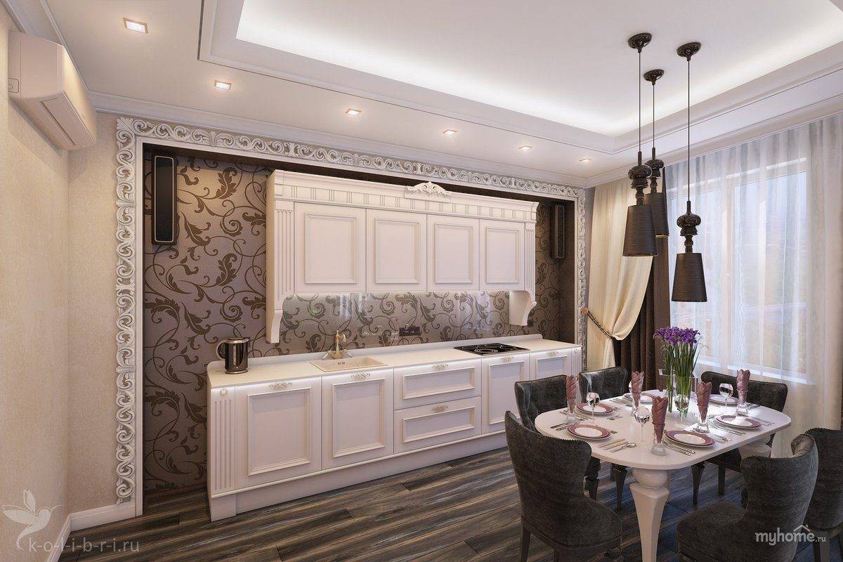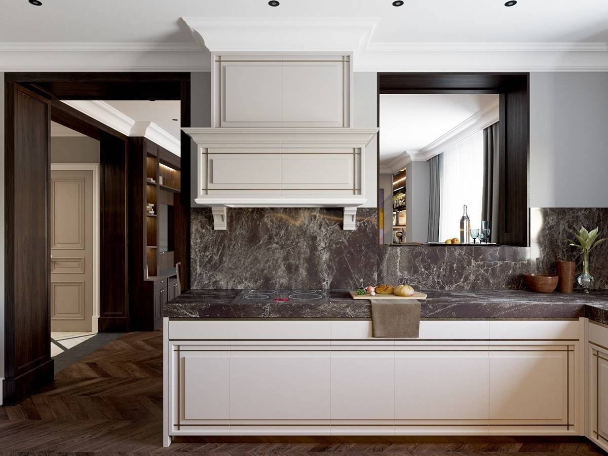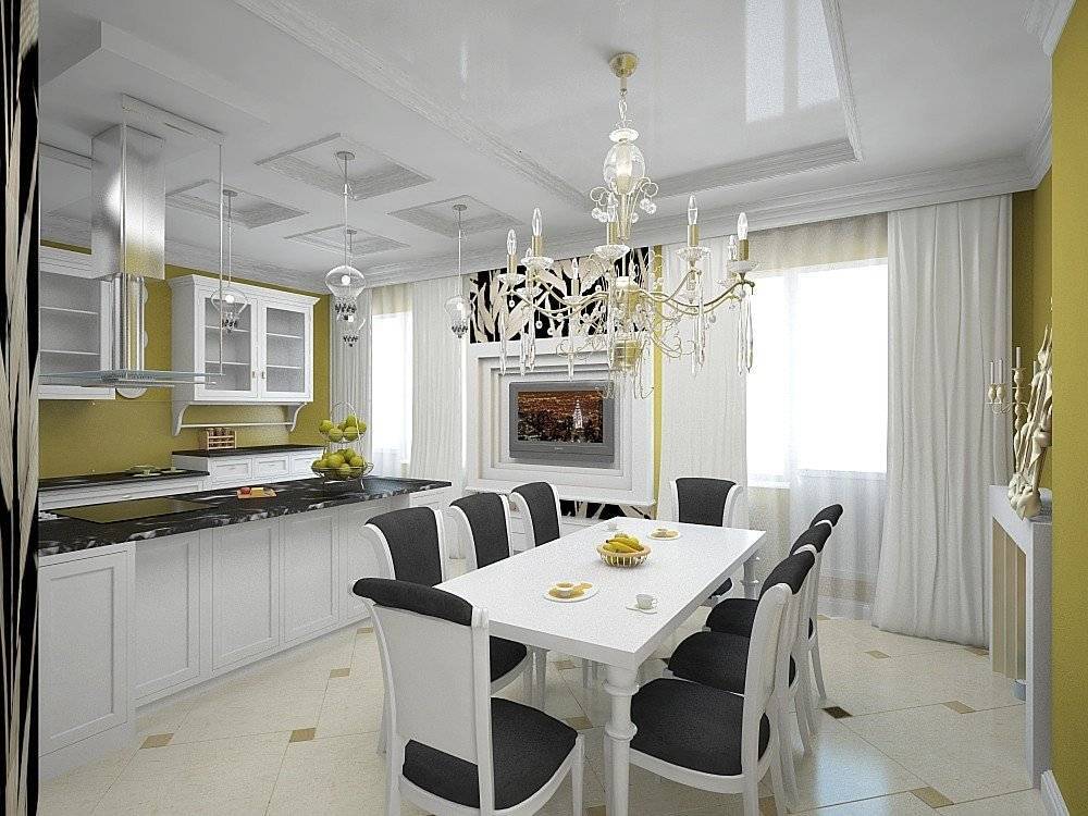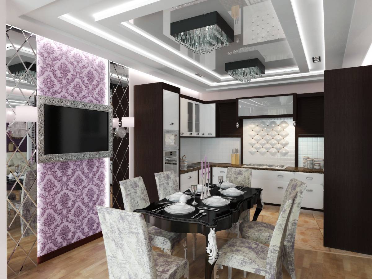 Планировка кухни отличается размахом и комфортом. Удачнее всего в интерьер вписывается гарнитур с островом. Классический дорогой паркет на полу заменяется черно-белой плиткой, выложенной в шахматном порядке, или контрастными ромбами. Обивка стульев выполняется из натуральной кожи. Для визуального увеличения пространства над барной стойкой размещается массивное зеркало в шикарной раме. С целью выделения обеденной и рабочей зон на потолке устраиваются перепады высоты, а на полу создается просторный подиум для стола и стульев. Основные черно-белые тона с небольшими вариациями позволяют гармонично вписать в интерьер кухонную технику со стальными или пластиковыми элементами.