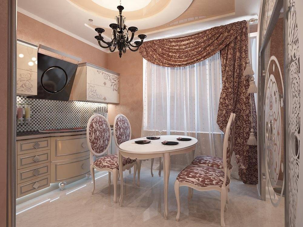 Обеденный стол лучше выбирать массивный (конечно, если площадь комнаты позволяет) укомплектованный стульями с гнутыми ножками и спинками причудливой формы. Для украшения стола используйте шелковую скатерть.