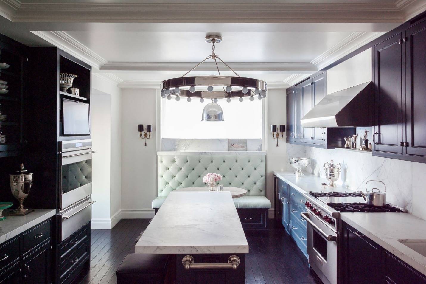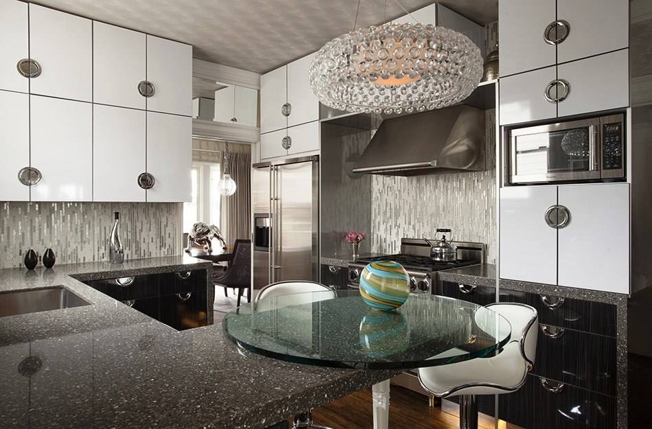 Современная кухня ар деко должна выглядеть дорого, но не чрезмерно. Поэтому следует избегать помпезности в выборе мебели и отделки, это касается и цветового оформления. Обилие золота, блеска в сочетании с обилием ярких цветов и оттенков может испортить чистоту стиля. В то же время отдельные золотые, бронзовые и латунные элементы приветствуются, особенно в комбинации с контрастом черного и белого.