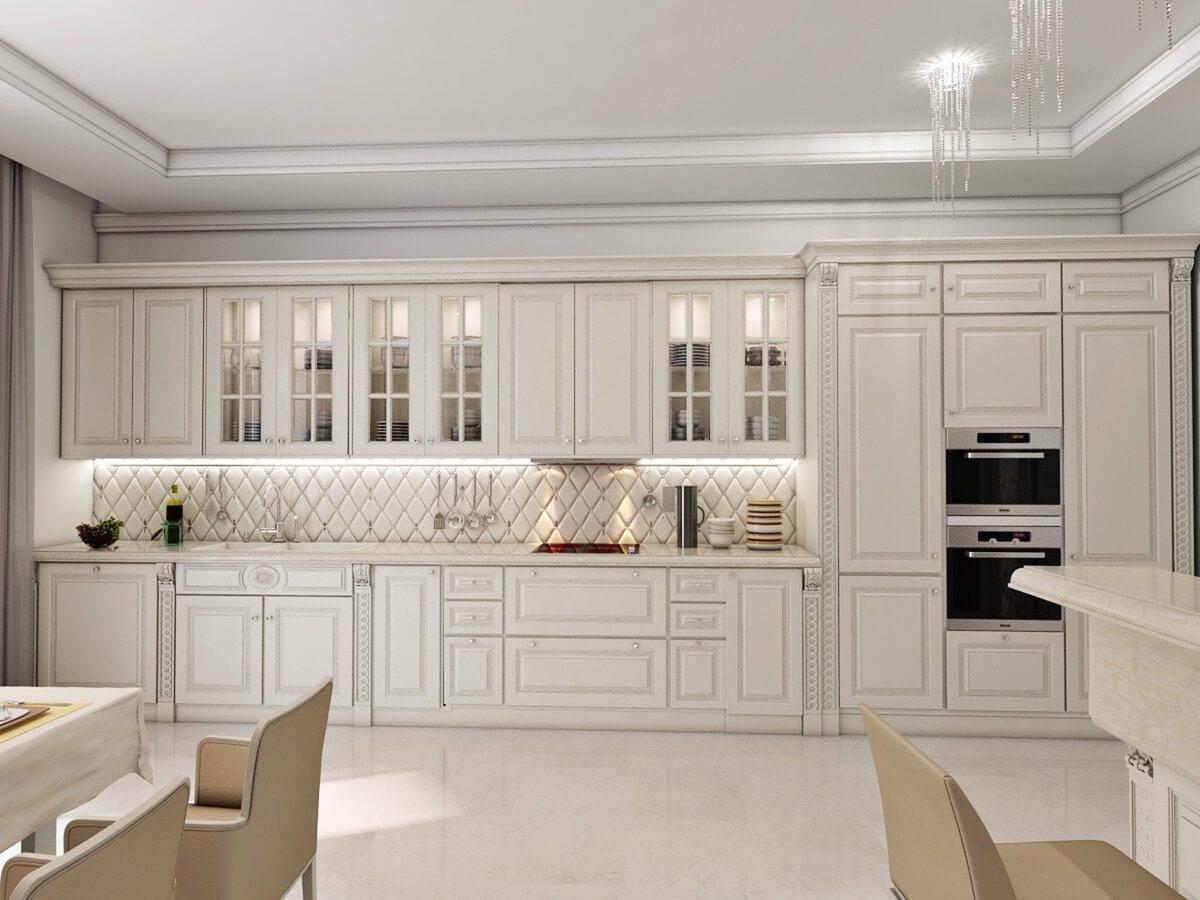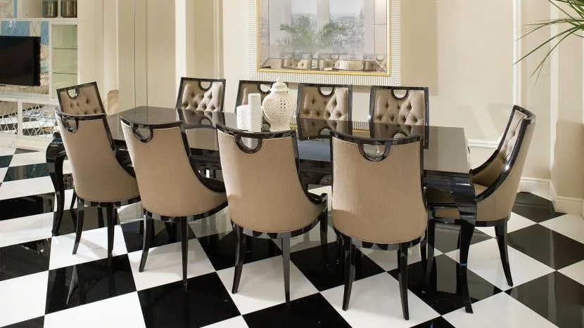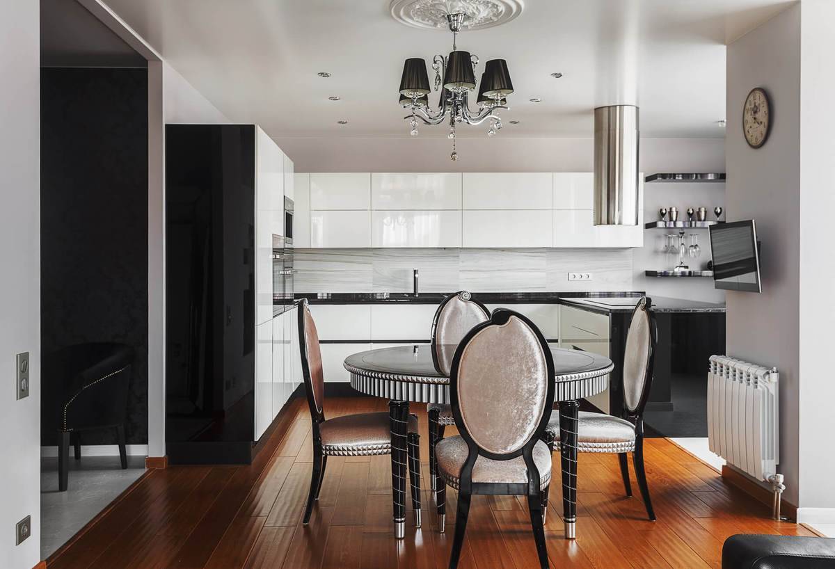 Еще более впечатляющей является кухня в стиле арт-деко в сочетании со столовой. В такое пространство вы можете ввести больше элементов, которые относятся к этому направлению. Декоративная мебель для столовой, такая как стол с причудливо вырезанными ножками и стулья с оригинальной спинкой, прекрасно сочетаются с кухонной гарнитуром. Не забывайте про экстравагантный пол из натурального камня.