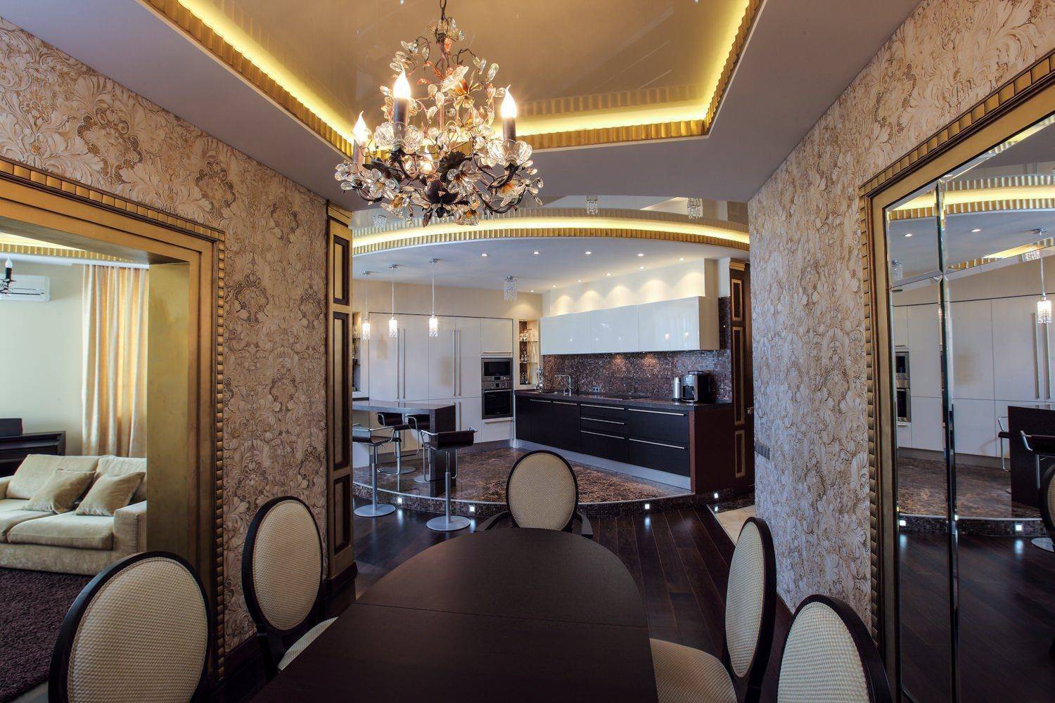 Полоток – многоступенчатый, глянец, с продуманной до мелочей подсветкой.