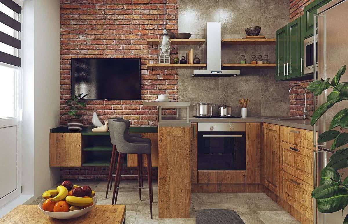 Дизайн кухни в стиле фьюжн предполагает применение классических и нестандартных решений в декоре стен, пола и потолка. Так, потолок может быть простым беленым, крашеным в яркий оттенок или обшитым ламинатом. Для отделки стен используют обои, штукатурку, кафель, обработанный кирпич, как на фото, краску, деревянные и стеклянные панели, гипсокартон, в том числе и конструкции замысловатых форм (ниши, колонны, арки). На пол, поскольку речь идет о кухне, можно положить керамическую и кафельную плитку, паркетную доску, ламинат, паркет.