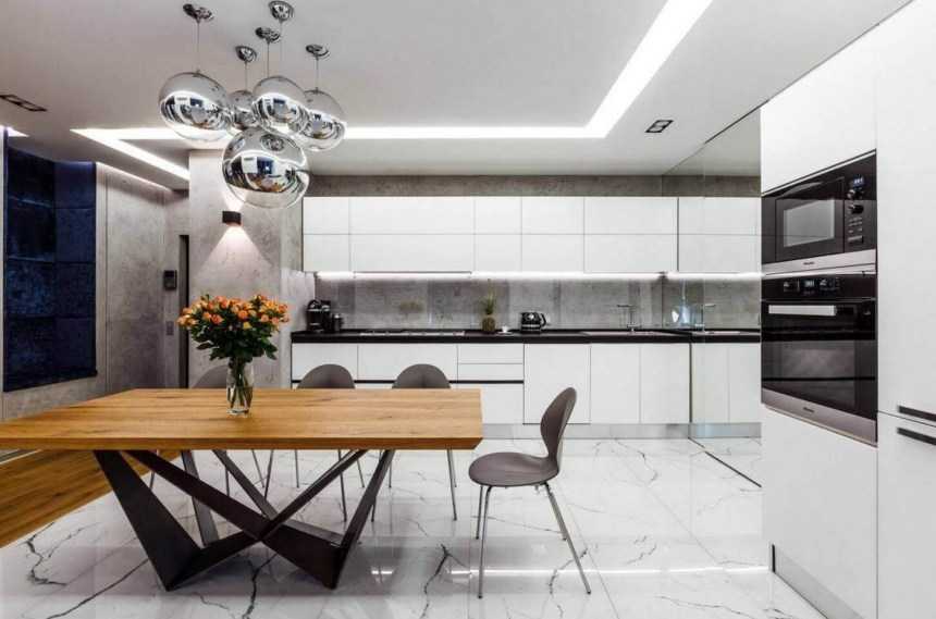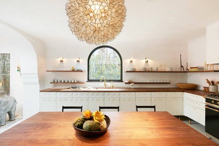 Крупная люстра над обеденной зоной поможет ее зонировать от рабочей;