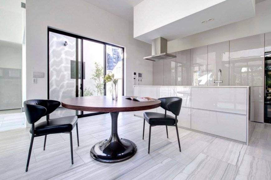 Обеденный стол эффектен из стекла, пластика, металла. Форма может быт любой: квадрат, круг, овал. Практичен остров с удобной стойкой, где прячутся стулья необычной формы и цвета.