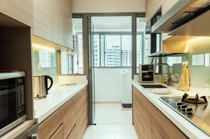 - В дизайне присутствует минимализм. Бытовая техника, лишние предметы спрятаны.