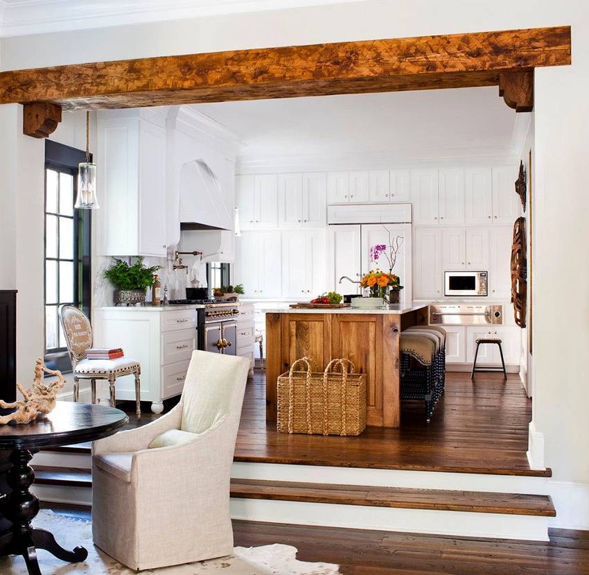 Классический, белый, матовый потолок – оптимальное решение для стиля кантри на кухне. Подчеркнуть аутентичность обстановки помогут деревянные балки или их имитация, уместны они в частном доме или в квартире с потолками выше 3 м. В частном доме потолок из бревен или вагонки подчеркнет деревенскую атмосферу.