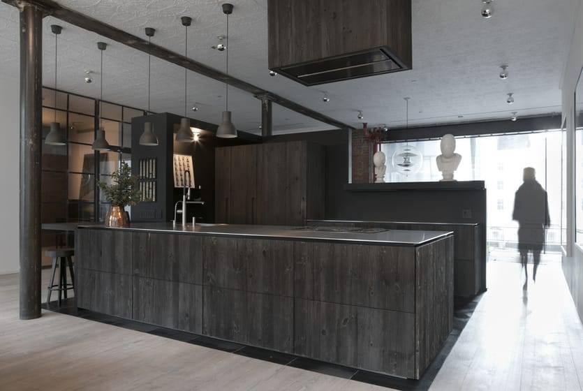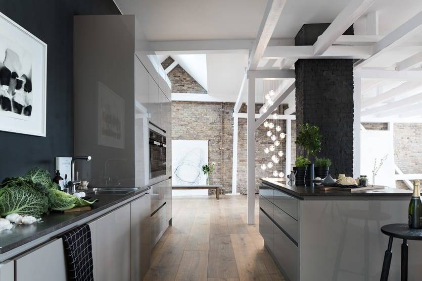 - Лофт – свободолюбивый стиль, и строгих рамок, которых необходимо придерживаться, в частности, при расстановке мебели, нет. Так, мойка или плита могут располагаться в центре кухни – островное расположение кухонного гарнитура со встроенным оборудованием является частым выбором при оформлении интерьера в этом стиле;