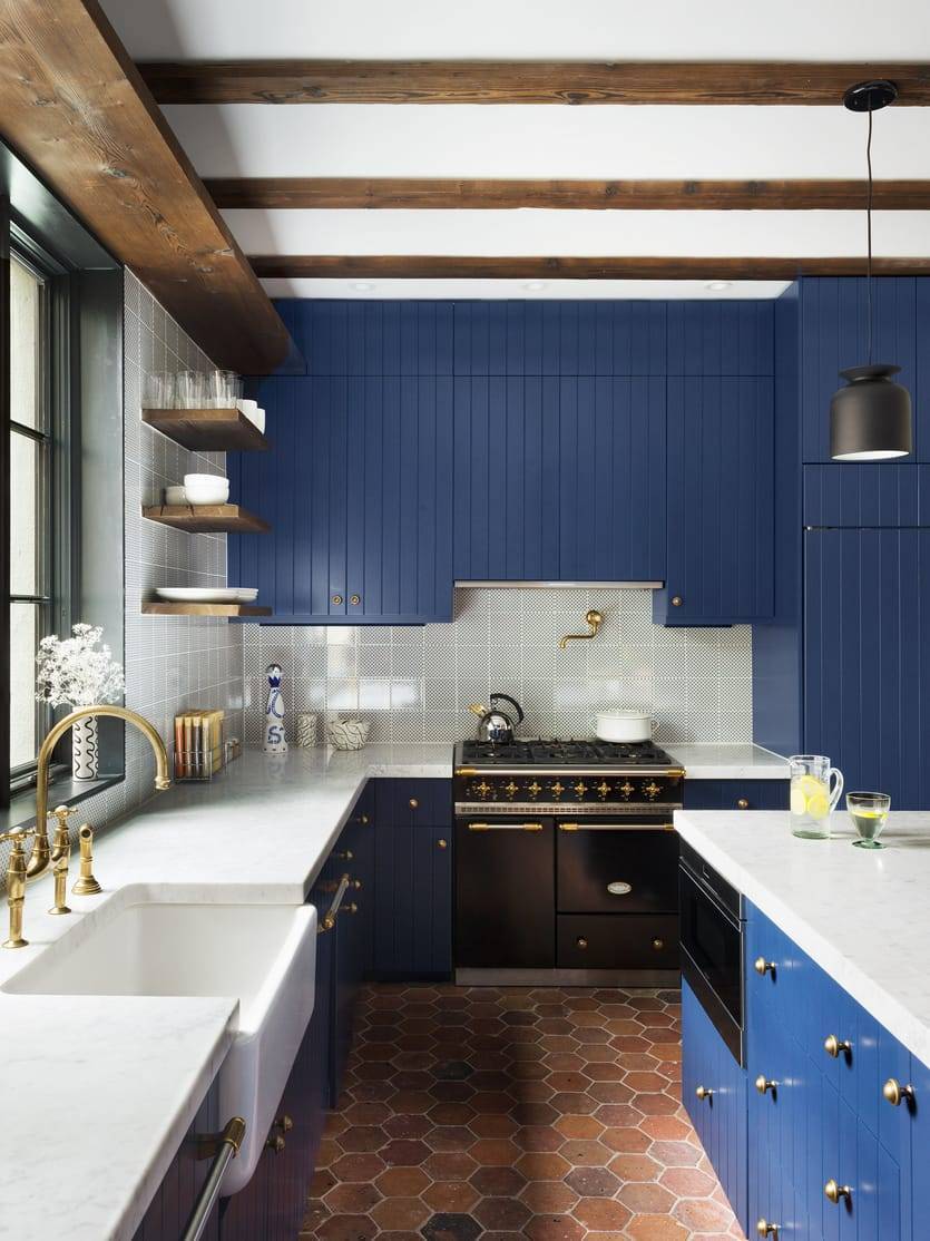 На фото однотонные синие стены в интерьере кухни, стиль тут задает рабочая зона с кирпичной отделкой.