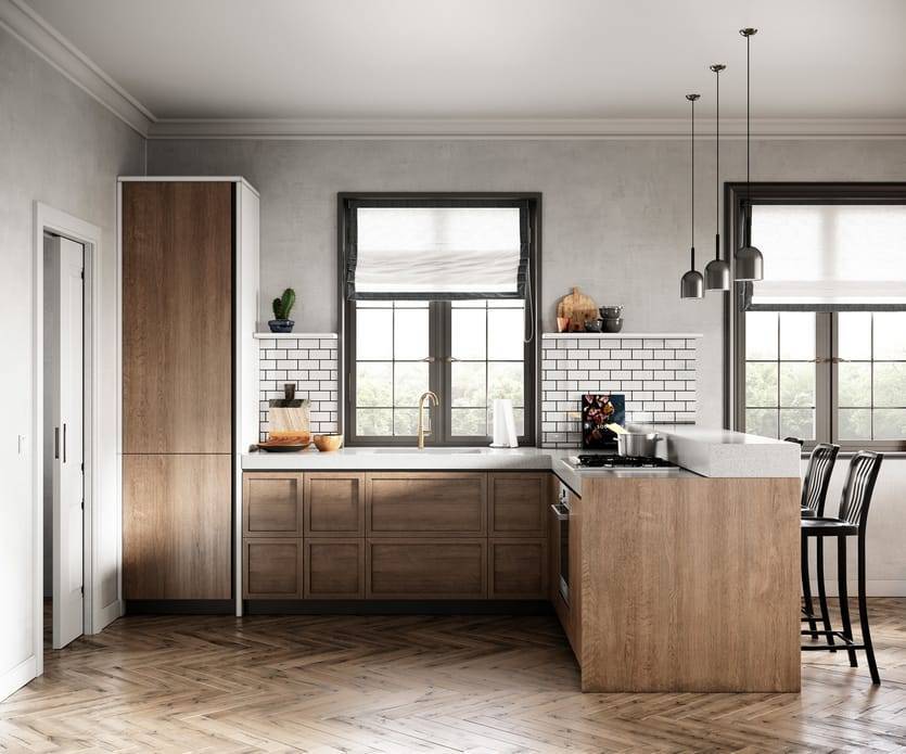 Подходящий для лофта дизайн кухонного гарнитура – с фасадами под дерево, из фанеры, с простыми гладкими серыми или белыми (лучше, если с глянцем) фасадами, филенчатыми, состаренными, под бетон.