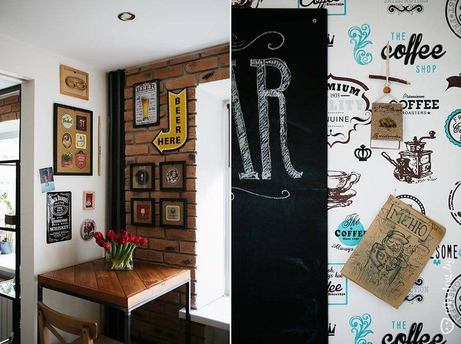 Стены кухни в стиле лофт уместно украшать незаурядными рекламными плакатами в стиле поп-арт, на которых изображена еда и напитки. Также можно развесить таблички с указателями или просто разрисовать одну из стен граффити. Допустимы также абстрактные и сюрреалистические картины, которые, если позволяют размеры помещения, можно расставить на полу, прислонив к стенам