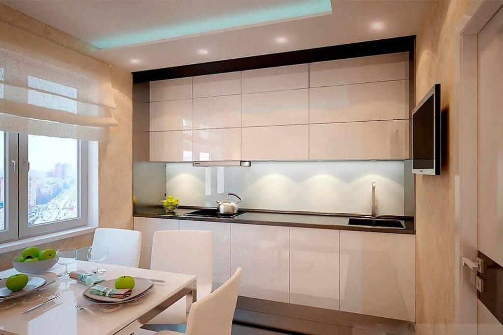 - хорошее и равномерное освещение (например, светодиодная подсветка – ее можно установить и по периметру потолка, и на стыке между стеной и навесным кухонным гарнитуром).