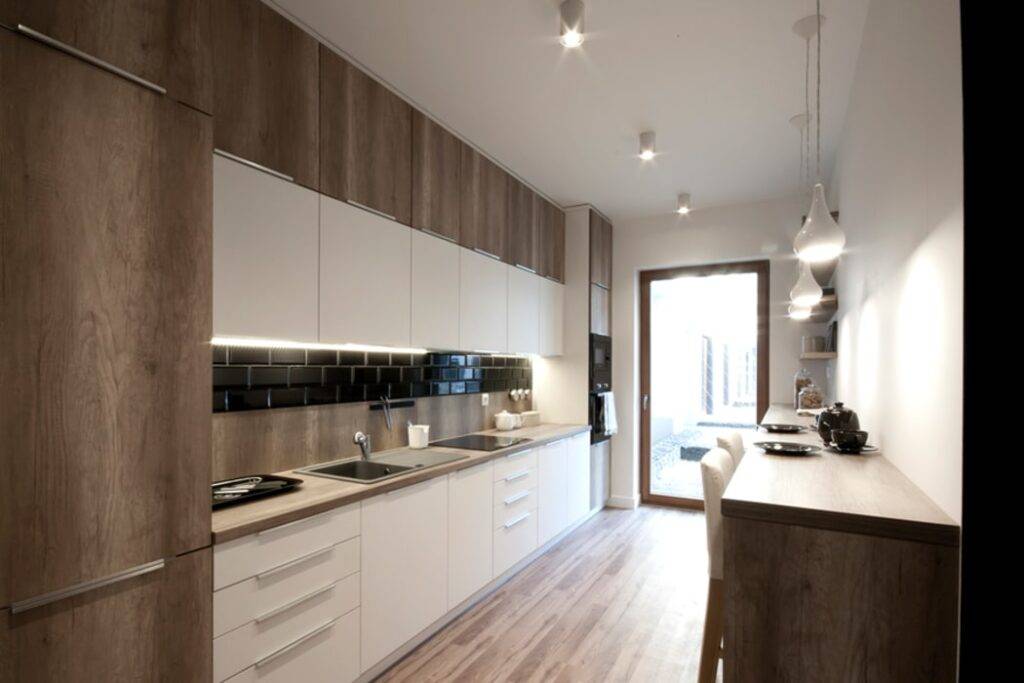 Чем меньше предметов и декора на кухне, тем большей она кажется, не так ли? Поэтому маленькая кухня в этом стиле – очень удачное решение, которое позволит визуально увеличить объем любого помещения. Создать дополнительный простор вам поможет:
