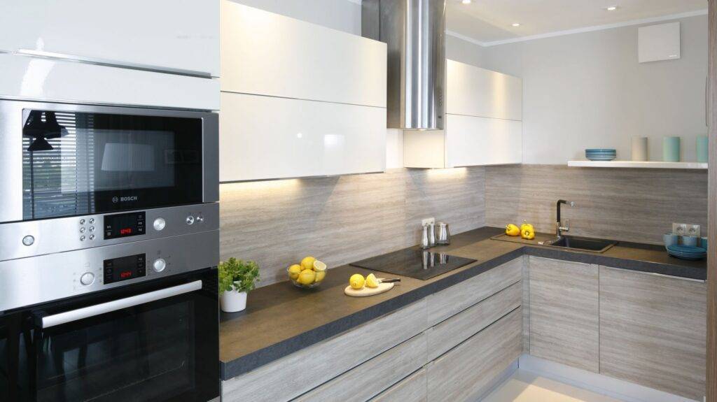 - Бытовая техника встраивается в гарнитур (полное отсутствие отдельно стоящих предметов).