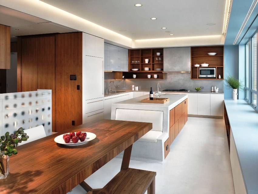 Потолок светлый. Для многих разновидностей кухонь подходит белый матовый вариант, редко используется глянец. Для отделки применяется натяжное полотно, краска, штукатурка. Если стены очень высокие, то можно замаскировать этот недостаток потолка разграничением его на функциональные зоны.