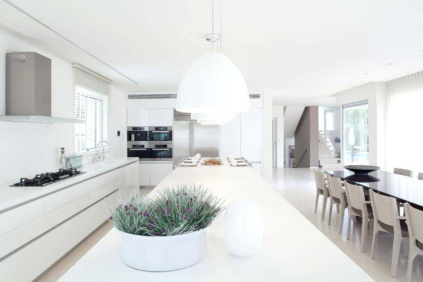 Стиль минимализм в интерьере кухни позволяет обустроить столовую с гостиной, а зонировать можно с помощью света и цвета