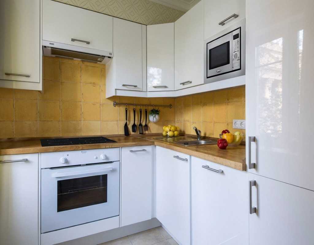 Белый цвет прекрасно комбинируется с другими цветами. Малогабаритная кухня только выиграет от применения классического сочетания черного и белого.