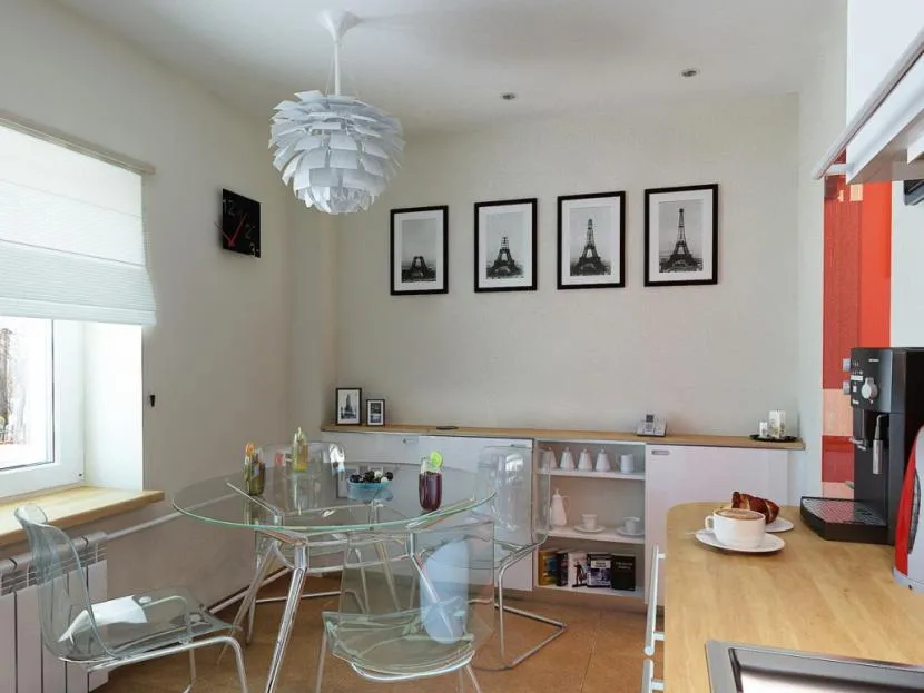 Ориентируясь на дизайн интерьера, следует подбирать и обеденный стол. Он может быть выполнен из пластика или стекла в сочетании с хромированными элементами, или из натурального дерева в строгом дизайне. Оригинально смотрится прозрачная мебель, например, стеклянная столешница на металлическом каркасе и пластиковые стулья. Они выглядят невесомыми и не загромождают интерьер.