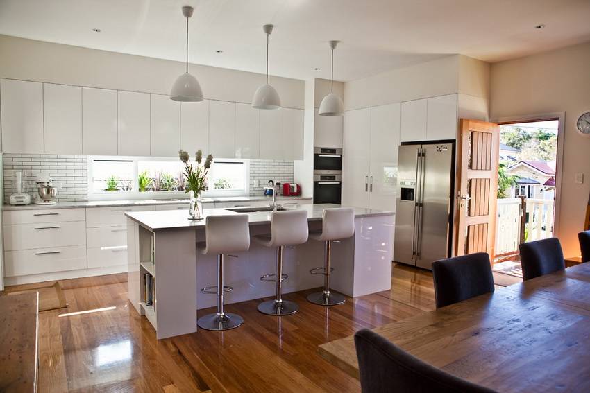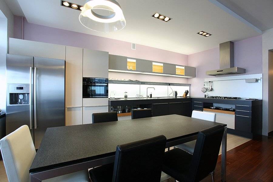 Эти два пункта крайне важны из-за частой встроенности мебели и техники, а также скрытой системы хранения. Иными словами, требуется продуманно расположить и сам кухонный гарнитур, в особенности шкафы, чтобы на все нашлось место.