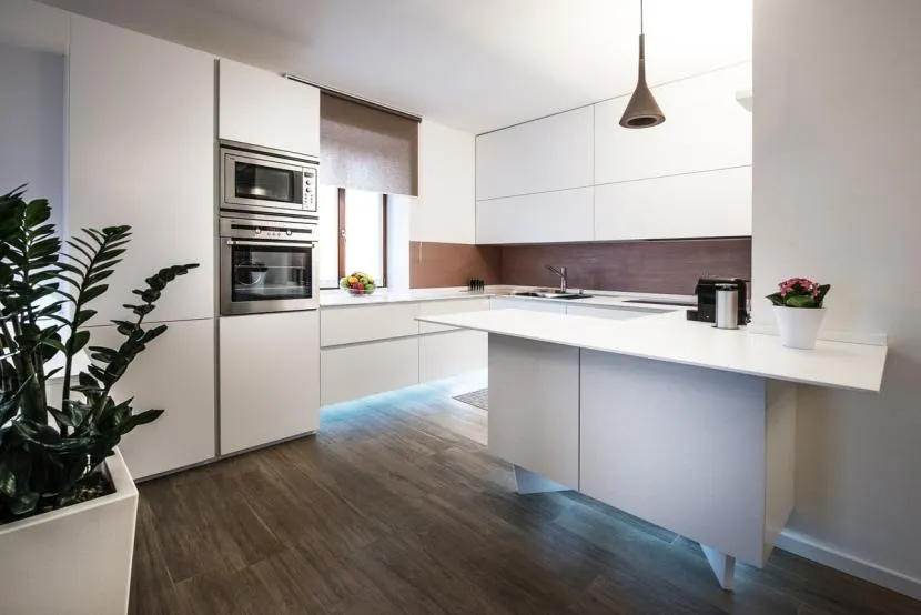 Гарнитур должен быть функциональным, желательно со встроенной техникой. На фасадах отсутствует декор, и даже от ручек можно отказаться, установив режим открывания от нажатия. Но со светлой поверхностью такое решение не самое практичное. Как вариант, можно выбрать фасады с интегрированными (скрытыми) ручками или профиль-ручки.