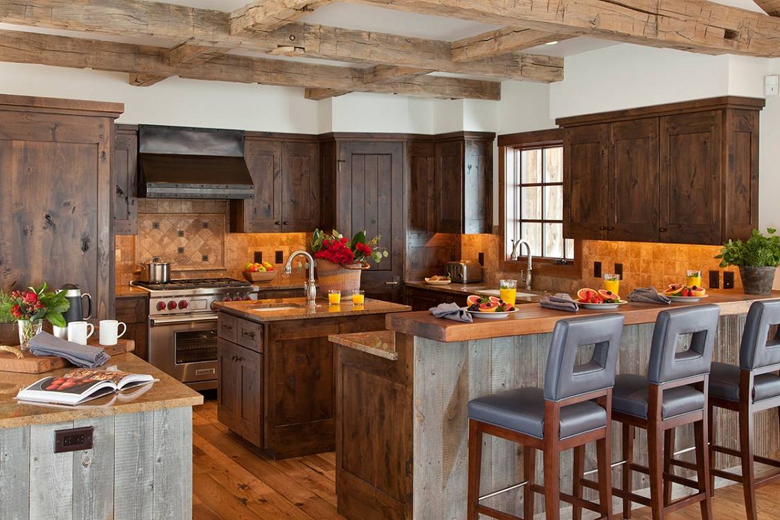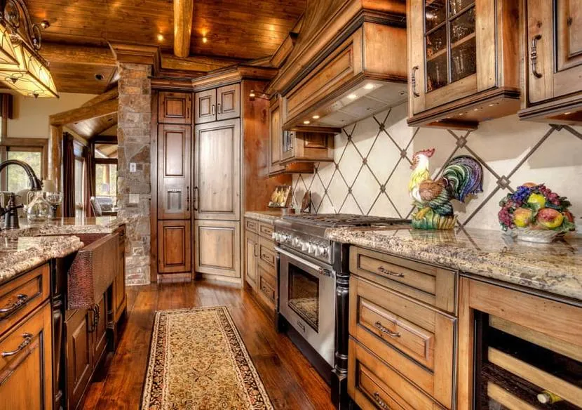 Креативный дизайн гарнитура в стиле шале подходит для организации кухни в охотничьем домике.