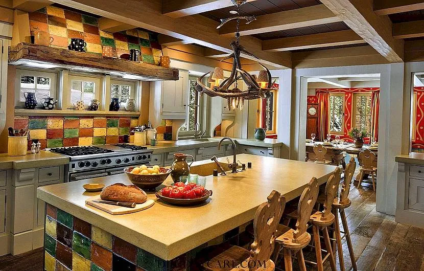 Главным элементом в интерьере кухни являются различные балки на потолке. Балки должны быть темного цвета, невыбеленные, грубо обработанные, чтобы намеренно «старить» древесину. Для напольного покрытия используется доска, покрытая лаком. При отделке стен дизайнеры советуют отдать предпочтение распиленному пополам бревну или деревянным панелям. Но это необязательно. Можно и просто покрыть штукатуркой бежевого, серо-бежевого или серого цвета. Стены можно отделать плиткой под камень. Так как весь интерьер выполняется в темных, серых и невзрачных оттенках, его можно разбавить глиняной посудой с ярким орнаментом (тарелками, вазочками, статуэтками), а также старинными кружевными шторками на шкафчиках. Люстра на потолок выбирается кованая, с деревянными элементами. Отлично подойдет люстра из чугуна или бронзы.