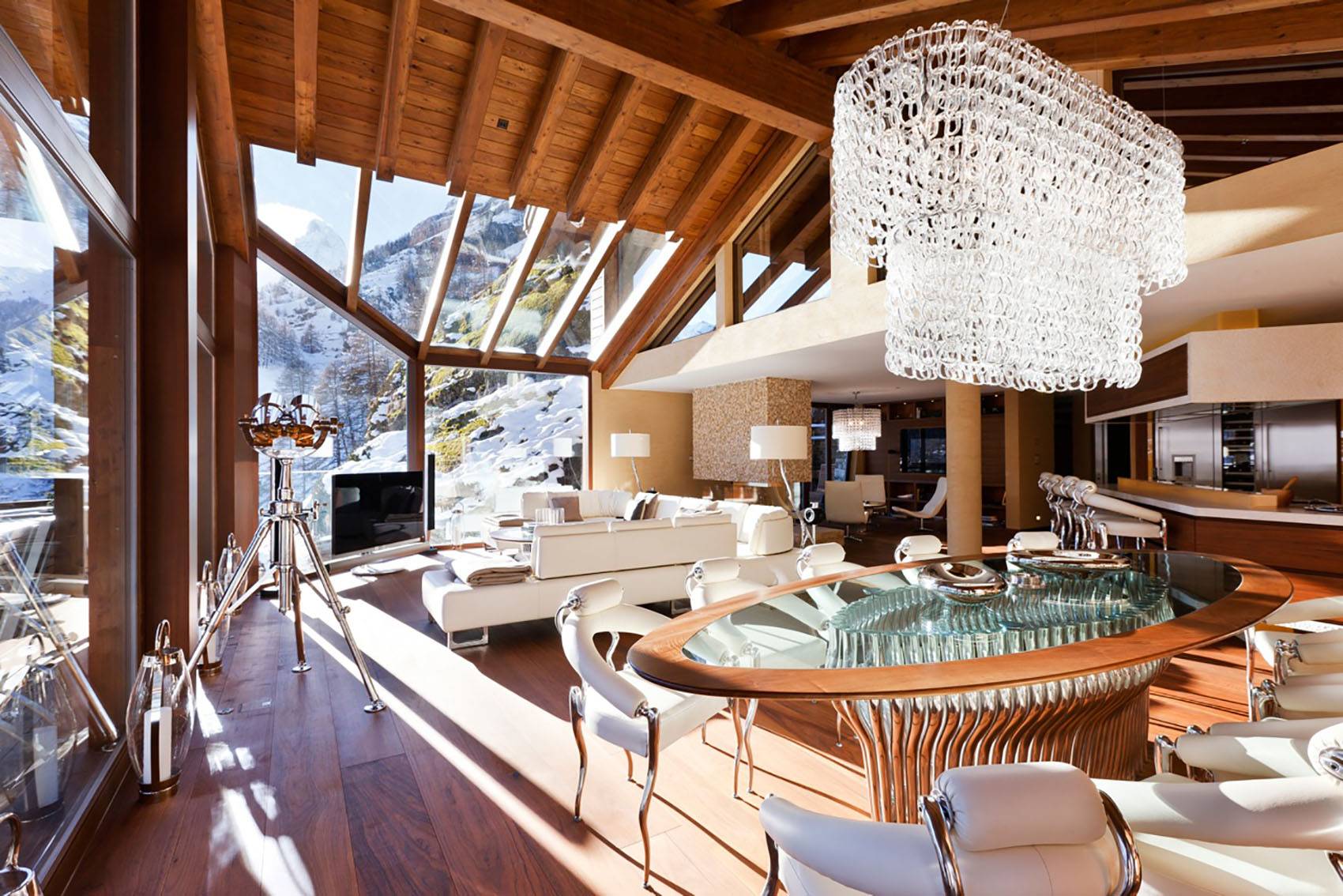 Деревянные колонны и арки прекрасно дополняют вид из окна на горные Альпы.