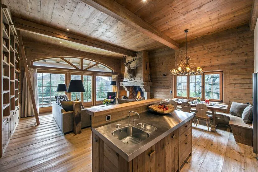 Массивные, грубо обработанные потолочные балки, деревянный неокрашенный пол, поверхности из камня и дерева — все это безусловные составляющие альпийского интерьера, которые сами по себе служат впечатляющим декором.