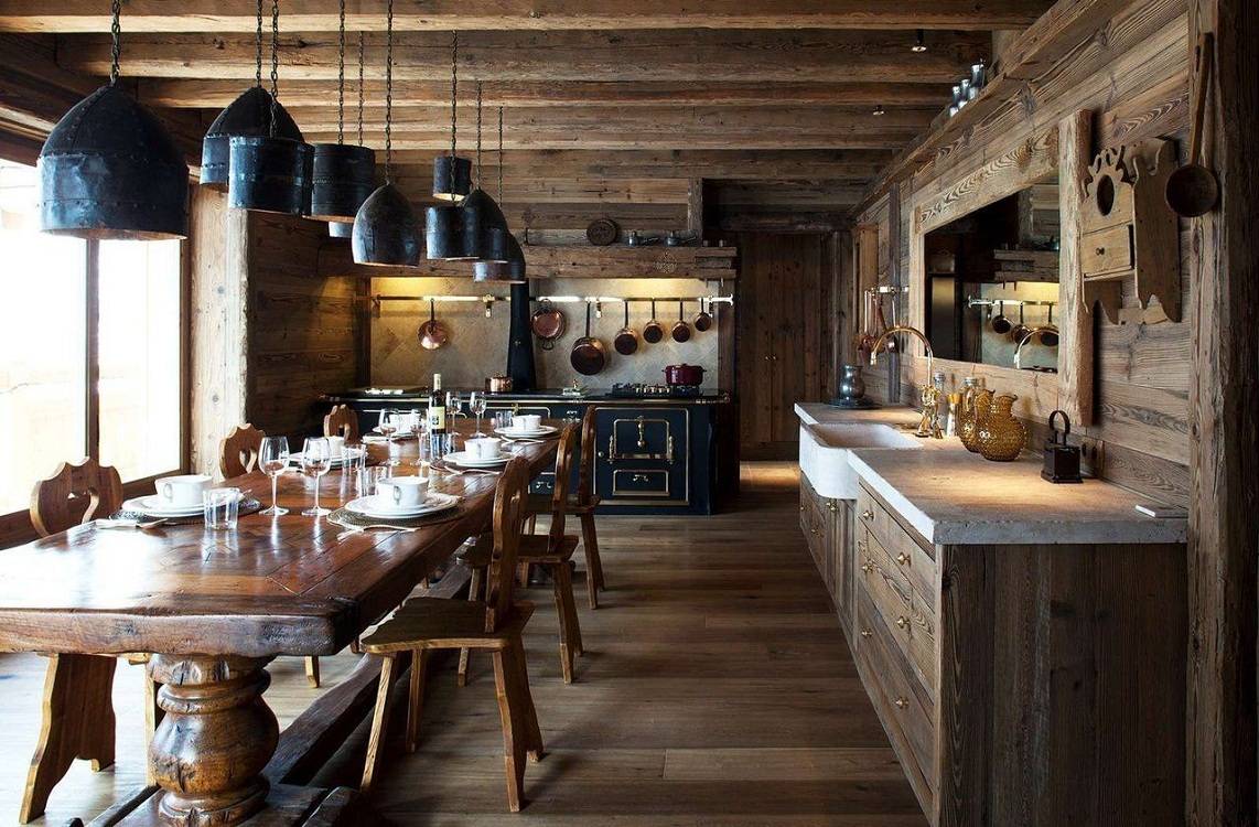 При выборе кухонной мебели предпочтение отдается цельной древесине. Отсутствие лакировки отлично сочетается со стилем шале. Но поскольку этот раствор защищает поверхность, обеспечивая долговечность, такой вариант также возможен.