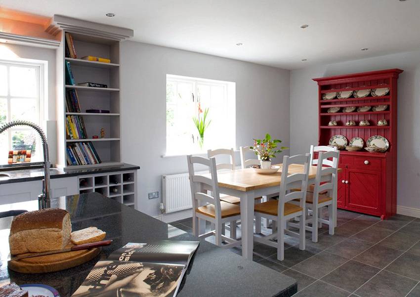 Чтобы мебель была максимально приближена к провинциальной деревенской, ее зачастую искусственно состаривают. Ни о какой полировке не может быть и речи. Если приобретение гарнитура из натурального массива владельцу жилья не «по карману», можно купить имитацию с МДФ отделкой. Шкафы и тумбы должны быть массивными и вмещать в себя много посуды.