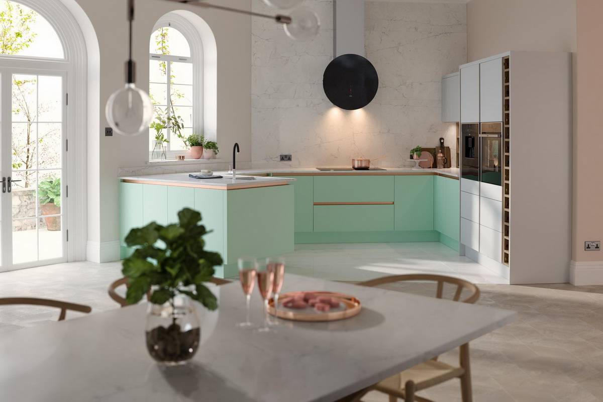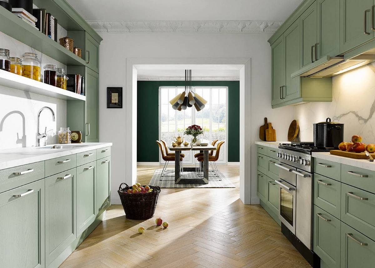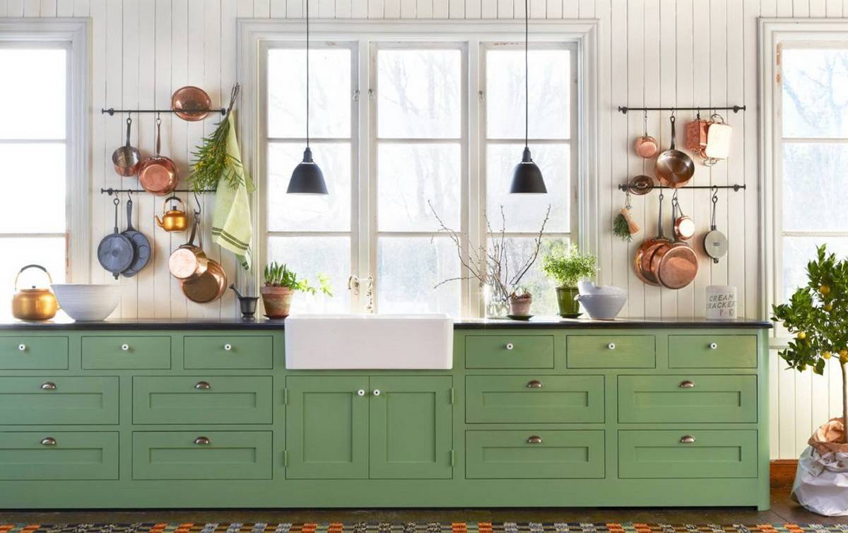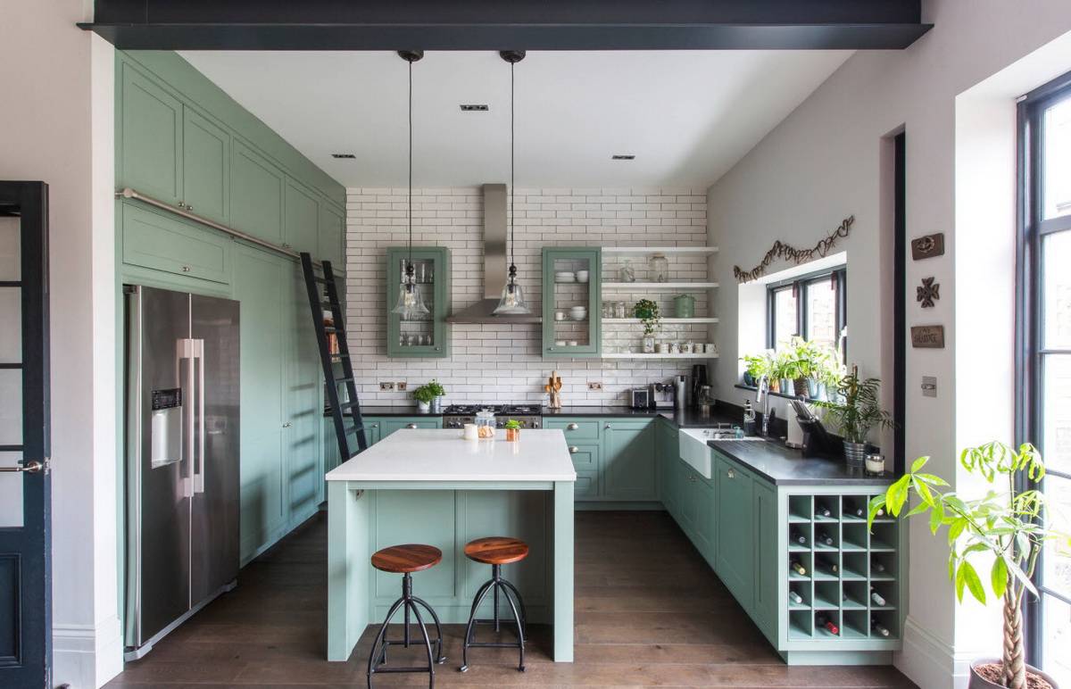 Мятные и серо-зеленые кухни в сочетании со светлой отделкой и деревом подойдут для современной кухни с намеком на кантри.