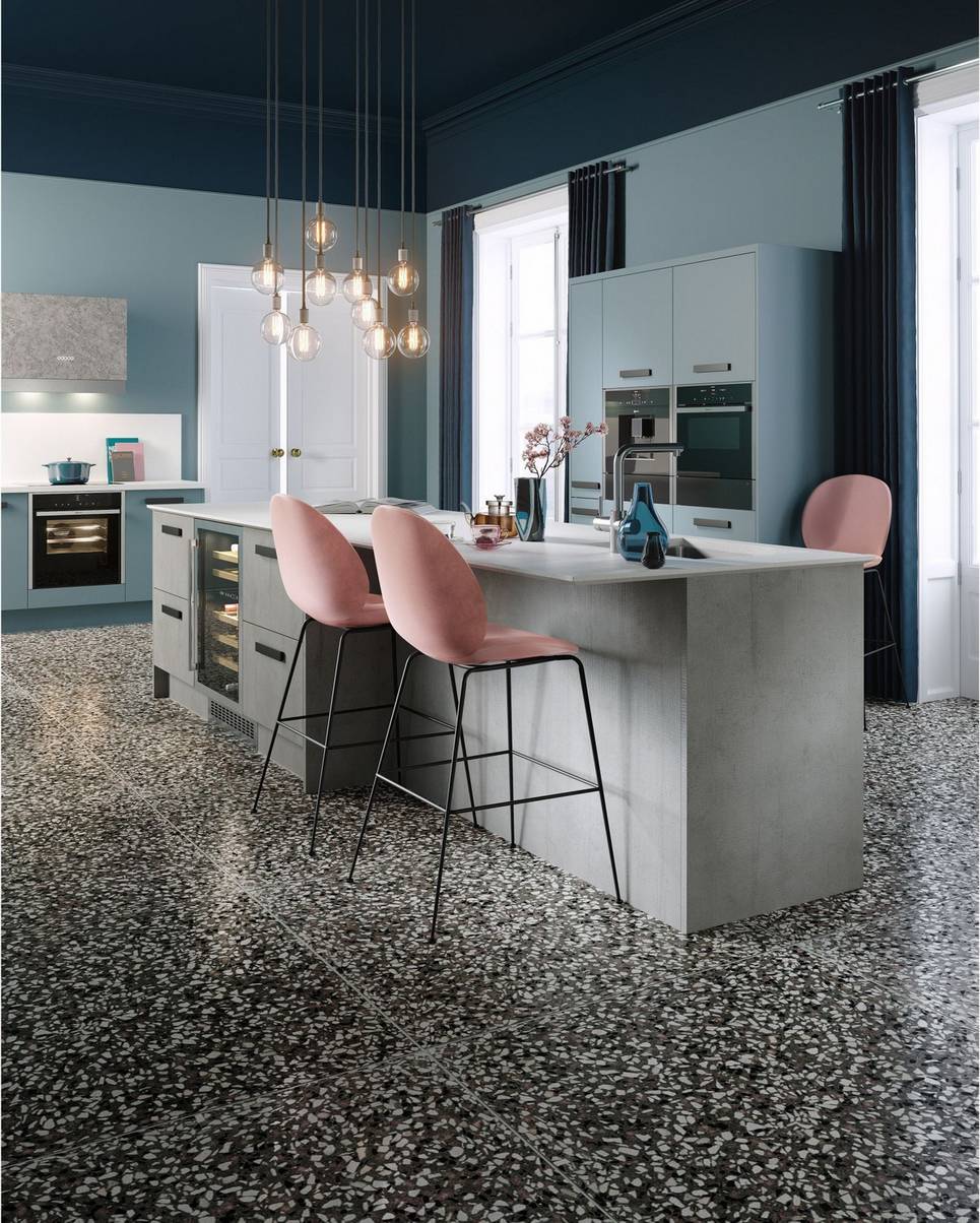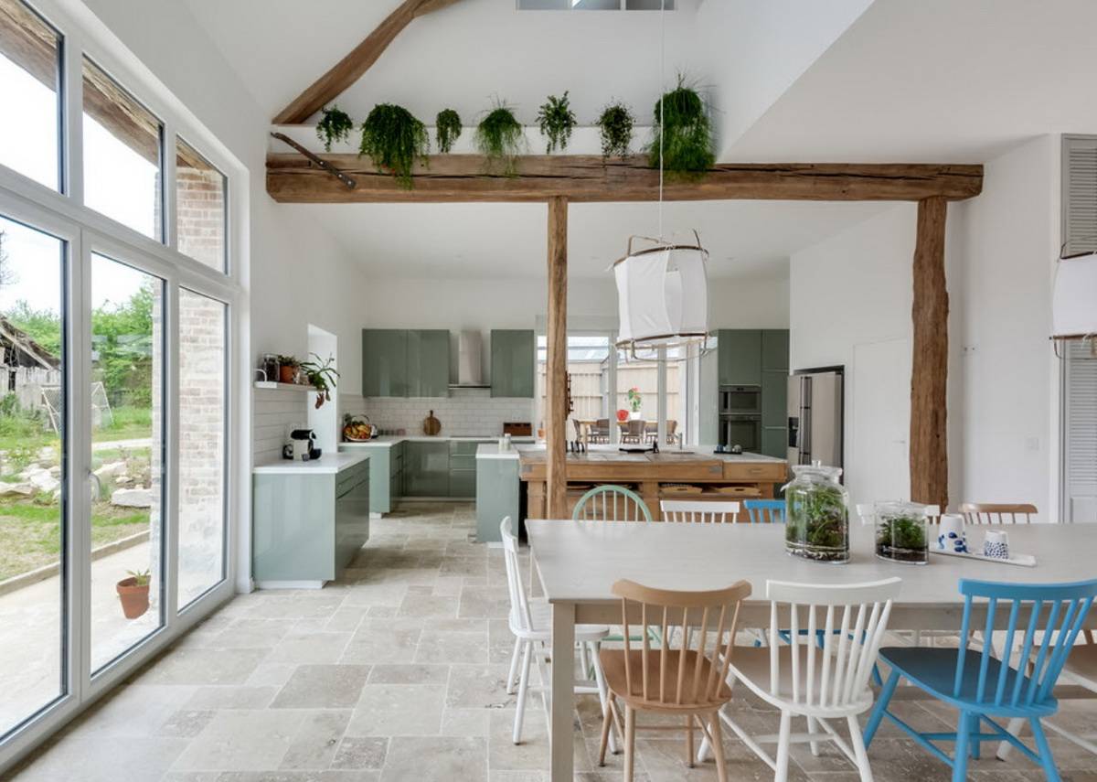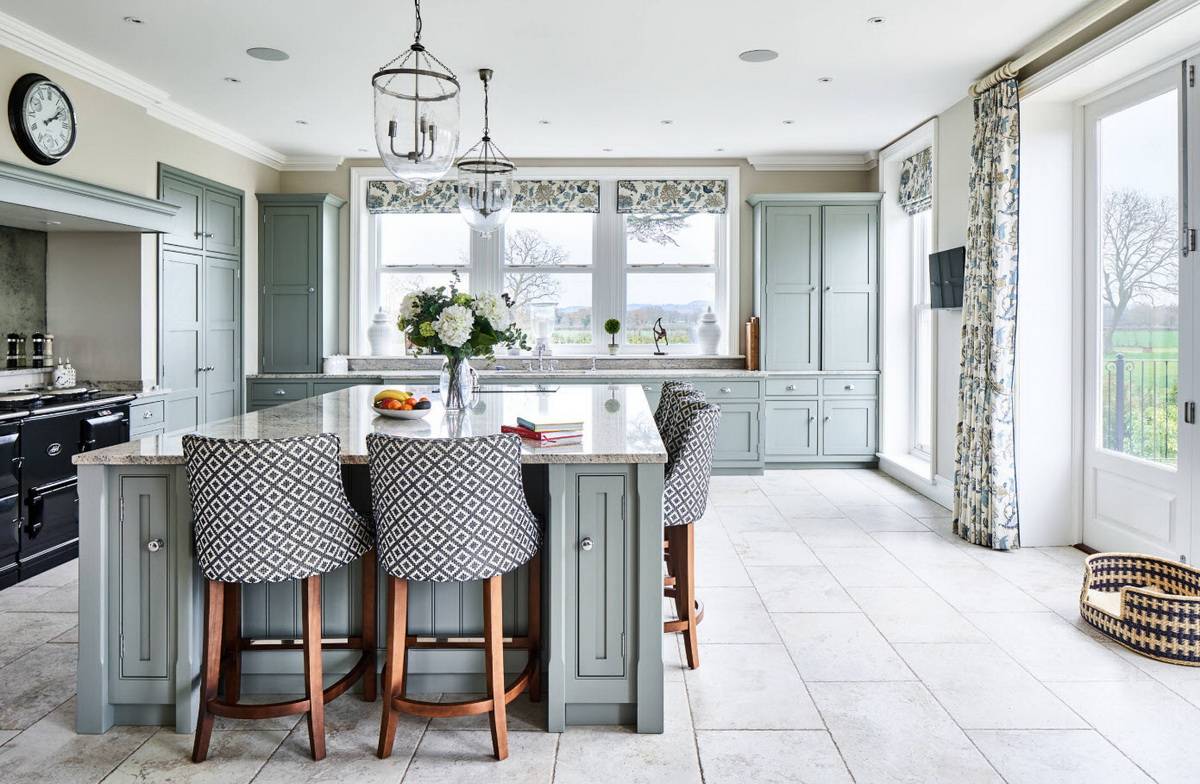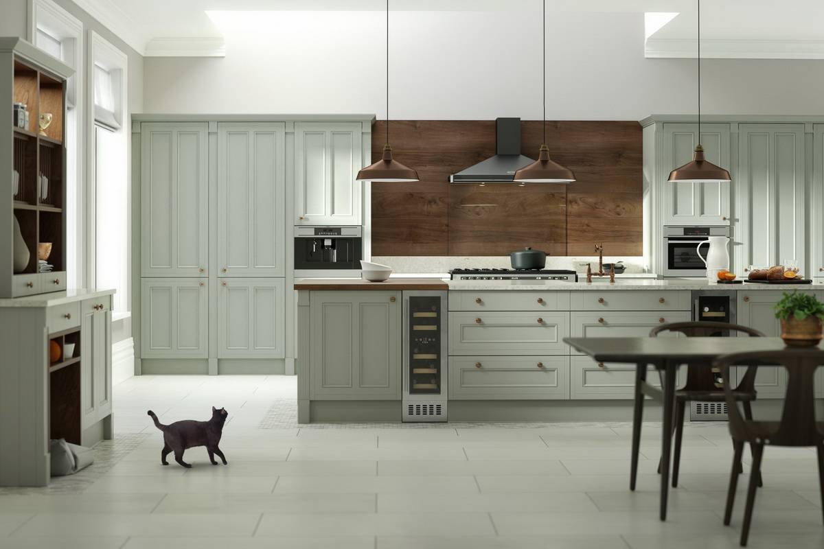 Мятные и серо-зеленые кухни в сочетании со светлой отделкой и деревом подойдут для современной кухни с намеком на кантри.